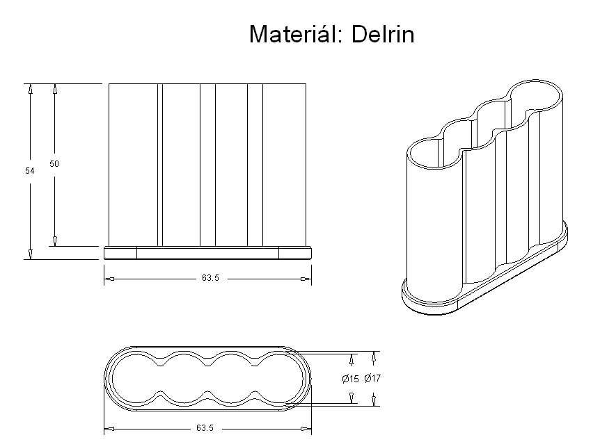 Pro začátek něco jednoduššího. Jak byste vyrobili tohle? K dispozici je blok Delrinu a CNC frézka, je potřeba 1 kus.