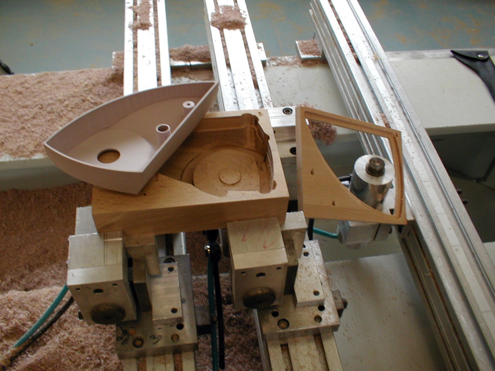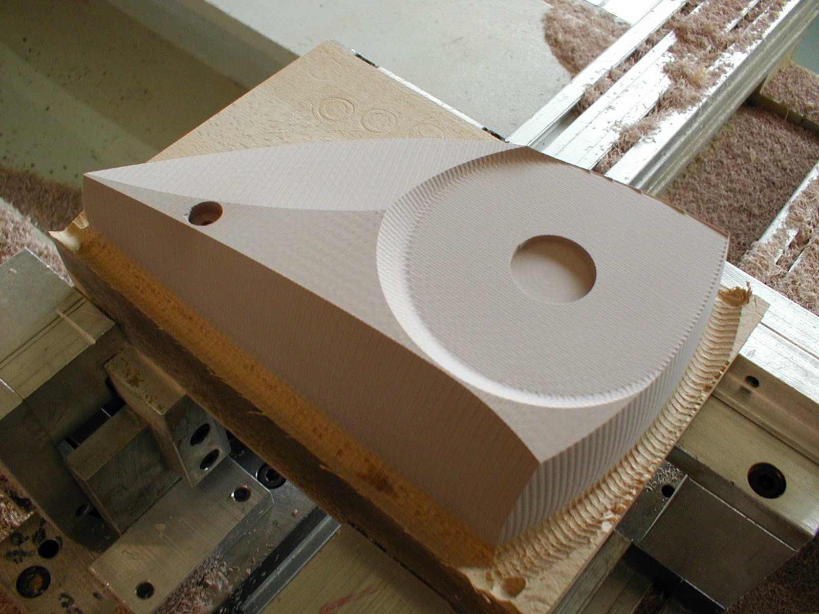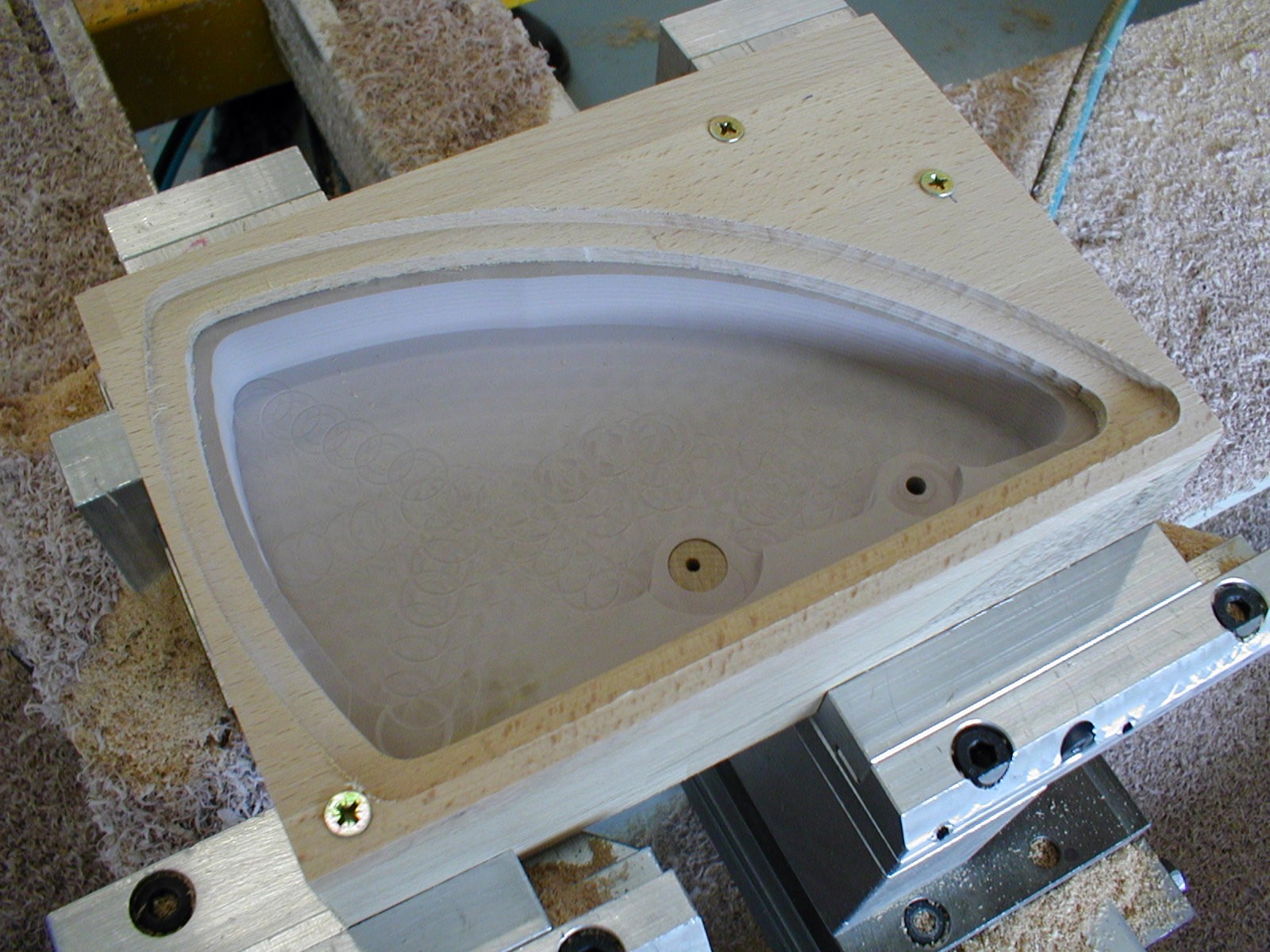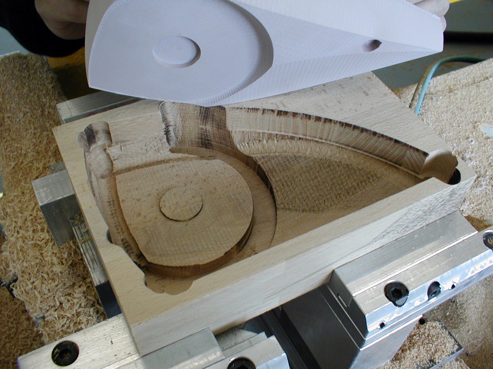 Skutečný postup (čímž netvrdím že nejsprávnější) byl, že se to frézovalo po vrstvách, 5 mm zvenku, 5 mm zevnitř (fréza 8 mm - dlouhá, 8000 otáček, tříska 0.25 mm, 4000 mm/s). Udělat to celé zvenku a pak zevnitř nešlo, protože to i tak mělo malý průřez, plast byl málo tuhý, vibroval i při těch malých třískách a dělalo se na povrchu "moaré". Přídavek 10 mm z každé strany zajistil dostatečnou tuhost. Potom se to nasadilo na trn (negativní tvar té dutiny) a ojel se spodek a zadní frézou srazily hrany.