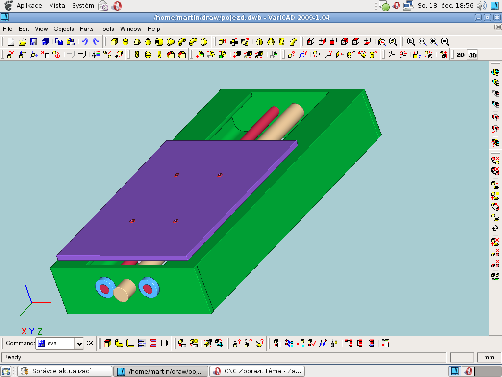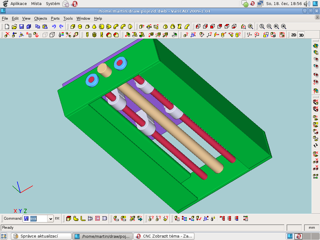 Udělal jsem první návrh spodní části frézy. Osu X (posouvat se bude stůl). Chtěl bych se vás zeptat, jestli vodící tyče průměru 10mm nejsou zbytečně tlusté (stůl bude z 5mm dřevotřísky). Jestli trapézový šroum prům. 16mm není zbytečně veliký, popřípadě, kde najít trapézy menších průměrů. na osy Y a Z bych si představoval vodící tyče prům. 6mm a nějáké trapézy. Vodící tyče si nechám indukčně zakalit. Všechno bych chtěl pohánět nějákými krokovými motory. Jako vřeteno (to co bude frézovat) bych si představoval přímou brusku EXTOL 130W (http://www.kutiltim.cz/prima-bruska-ext ... sada-40ks/)