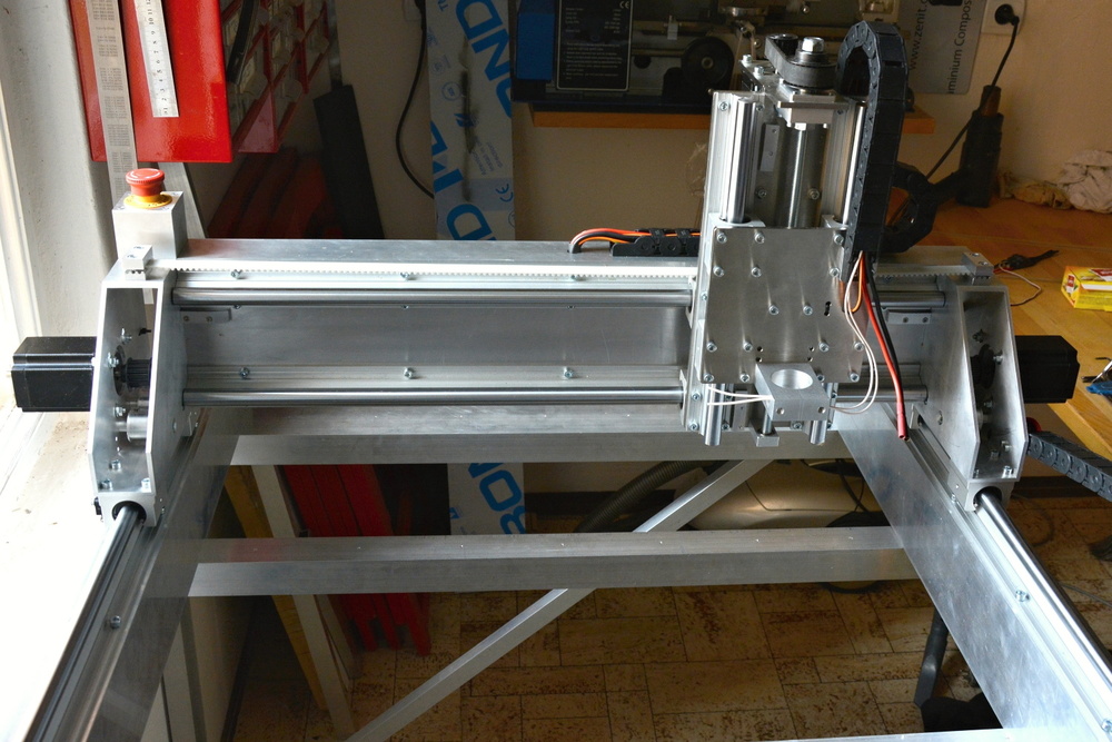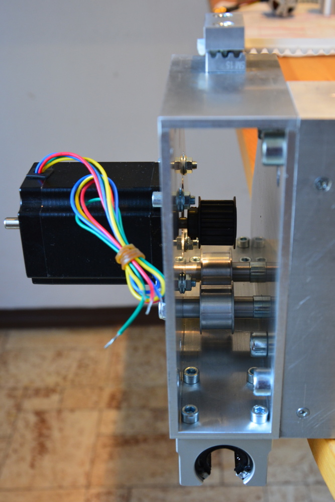 napínání řeším posunutím motoru. Na fotce je detail kladek i sestava frézky