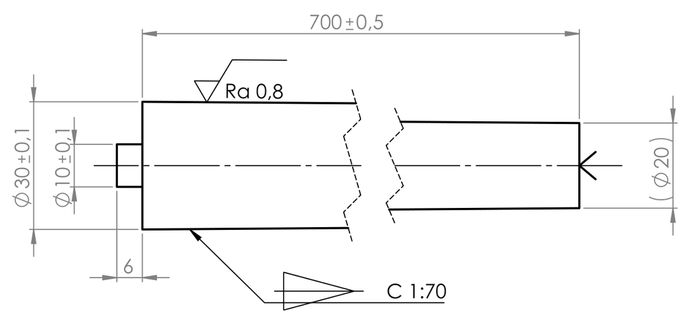 Dobrý den, potřebuji vyrobit takovéto kónusy 1:70. Pokud je požadavek na drsnost 1.6 nereálný, tak se prosím nepohoršujte a opravte mě. Na rozměrech důlku vpravo nezáleží, stačí aby tam byl, s hloubkou alespoň 6 mm. Stejný kus potřebuji vyrobit ze čtyř různých materiálů, a to 11SMn30, S235, C45 a 16MnCr5.