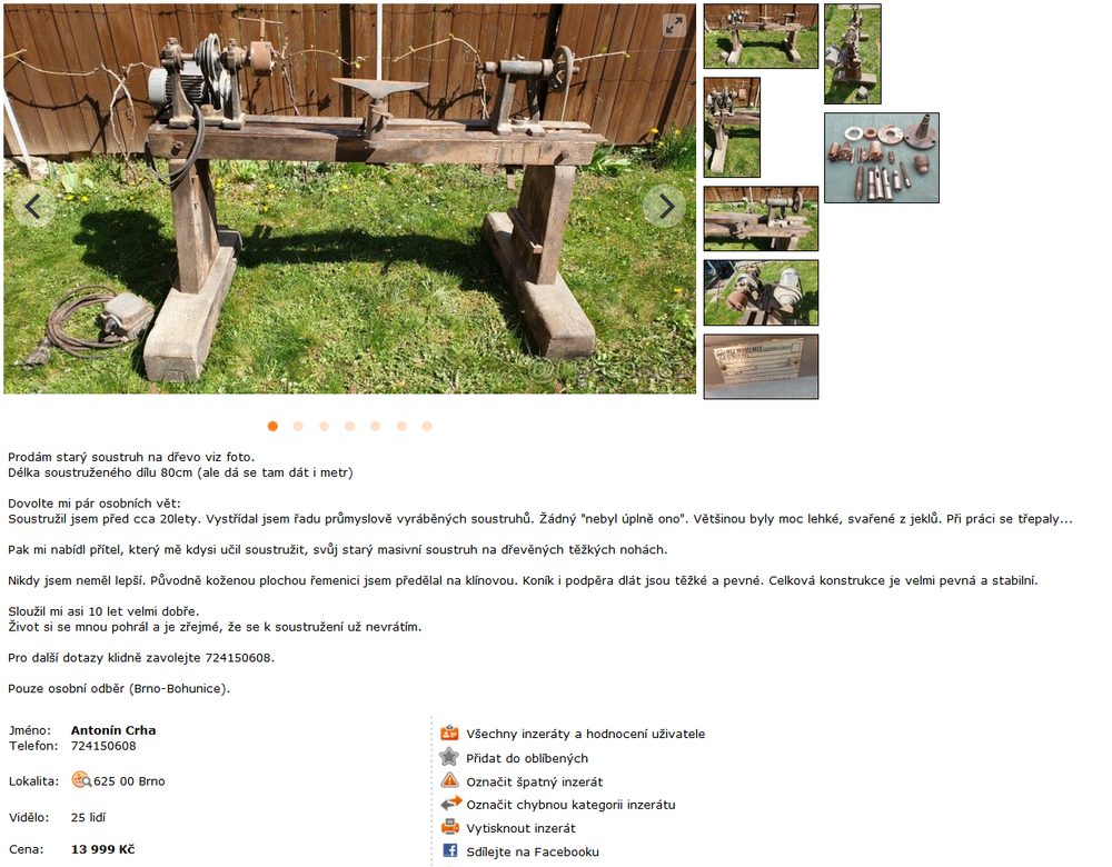 Je to krásný masivní soustruh na dřevo, na lepším pán nikdy ještě nepracoval. Lepší, než průmyslově vyráběné stroje. A cena rozhodně není k zahození