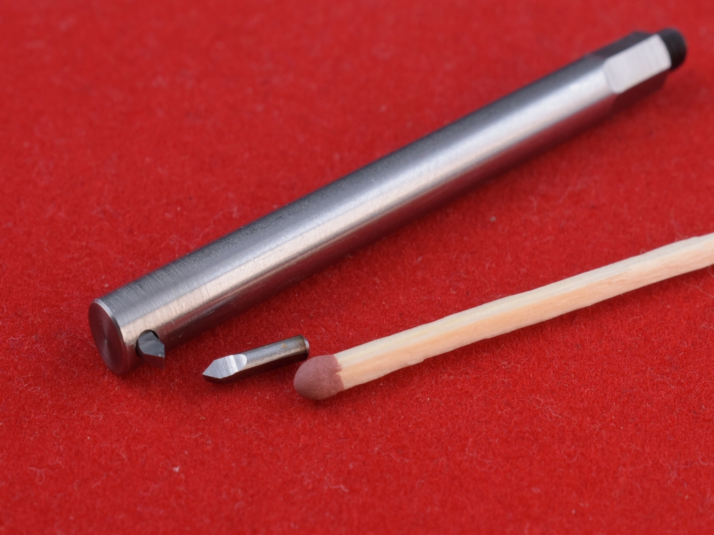 Jedna ukázka z dnešní práce, malý nožík na vyvrtávání nebo na vnitřní závity, jde použít do upínače 6mm nožů nebo pomocí prisma přímo do nožový hlavy či do toolpostu. Břit má průměr 2mm, v noži je TK, vedle něj HSS. a nechybí moje oblíbená sirka. :lol: