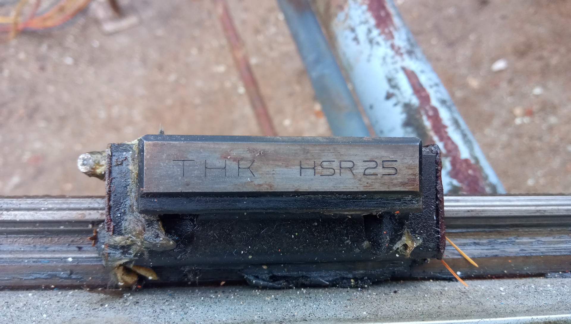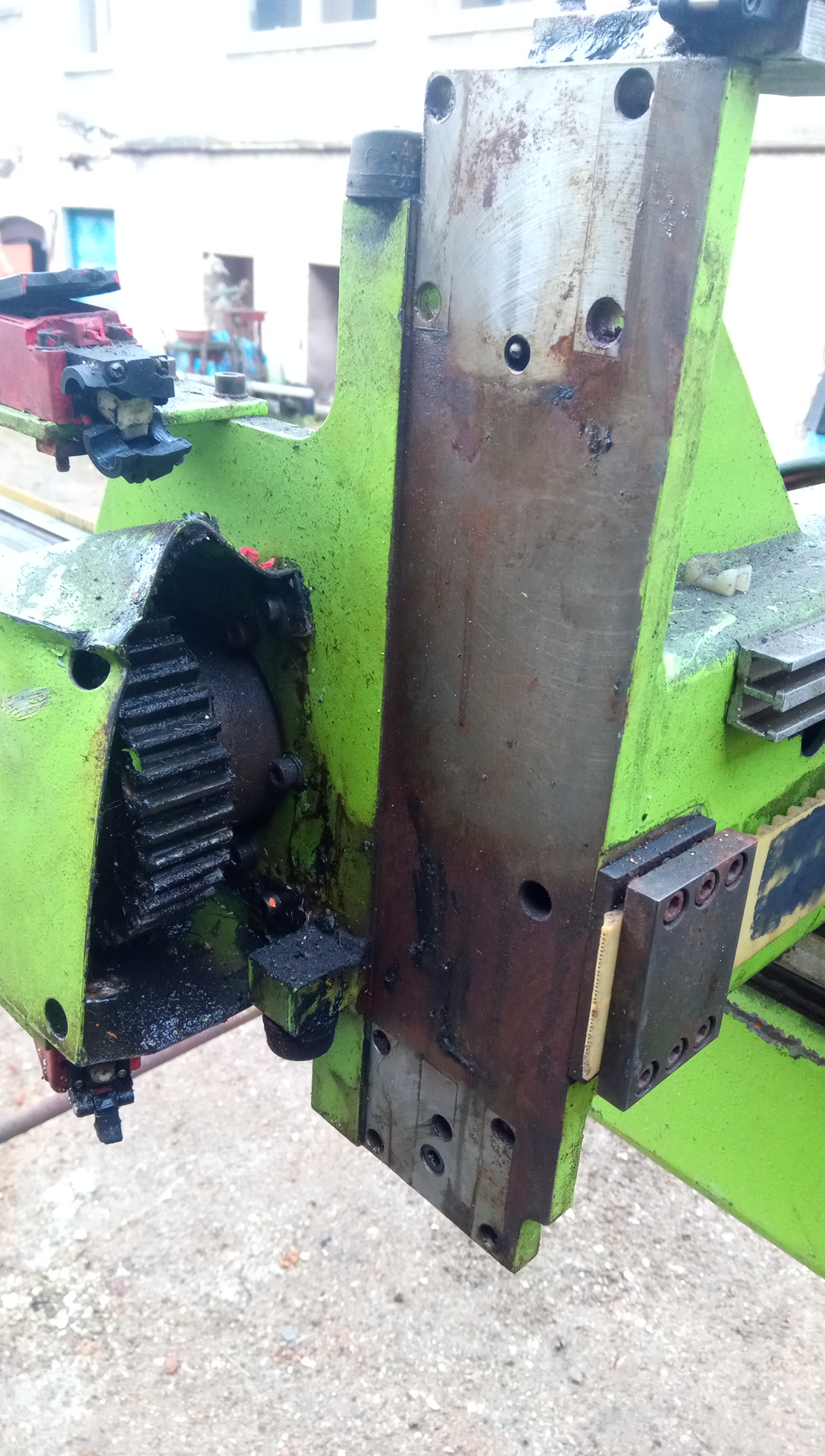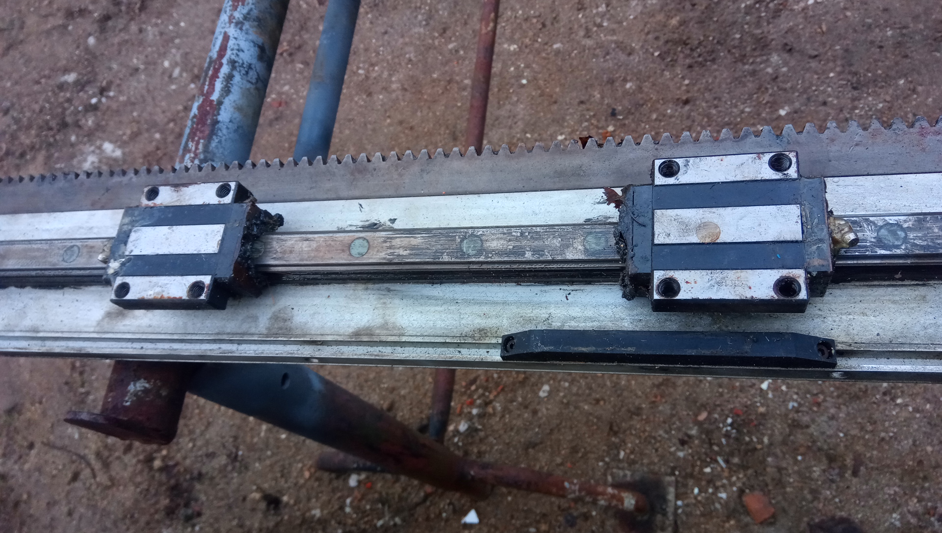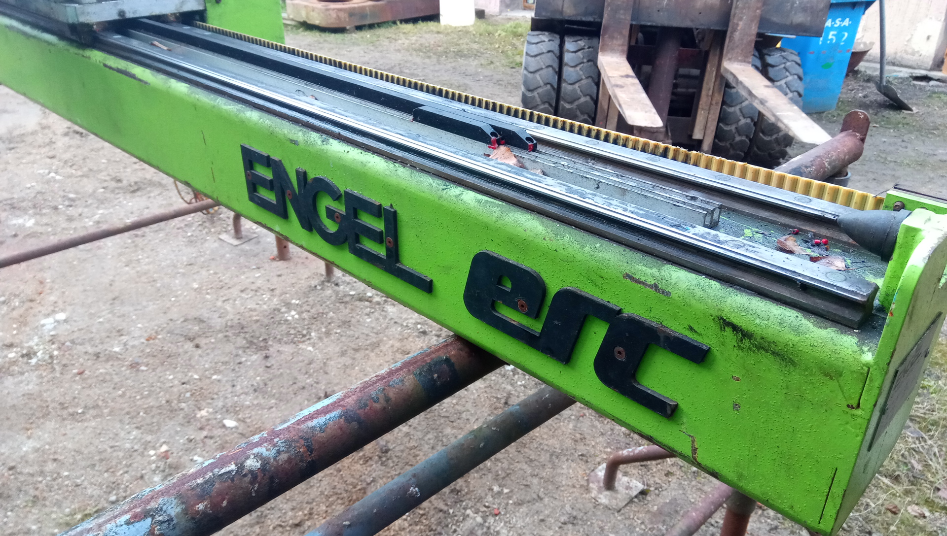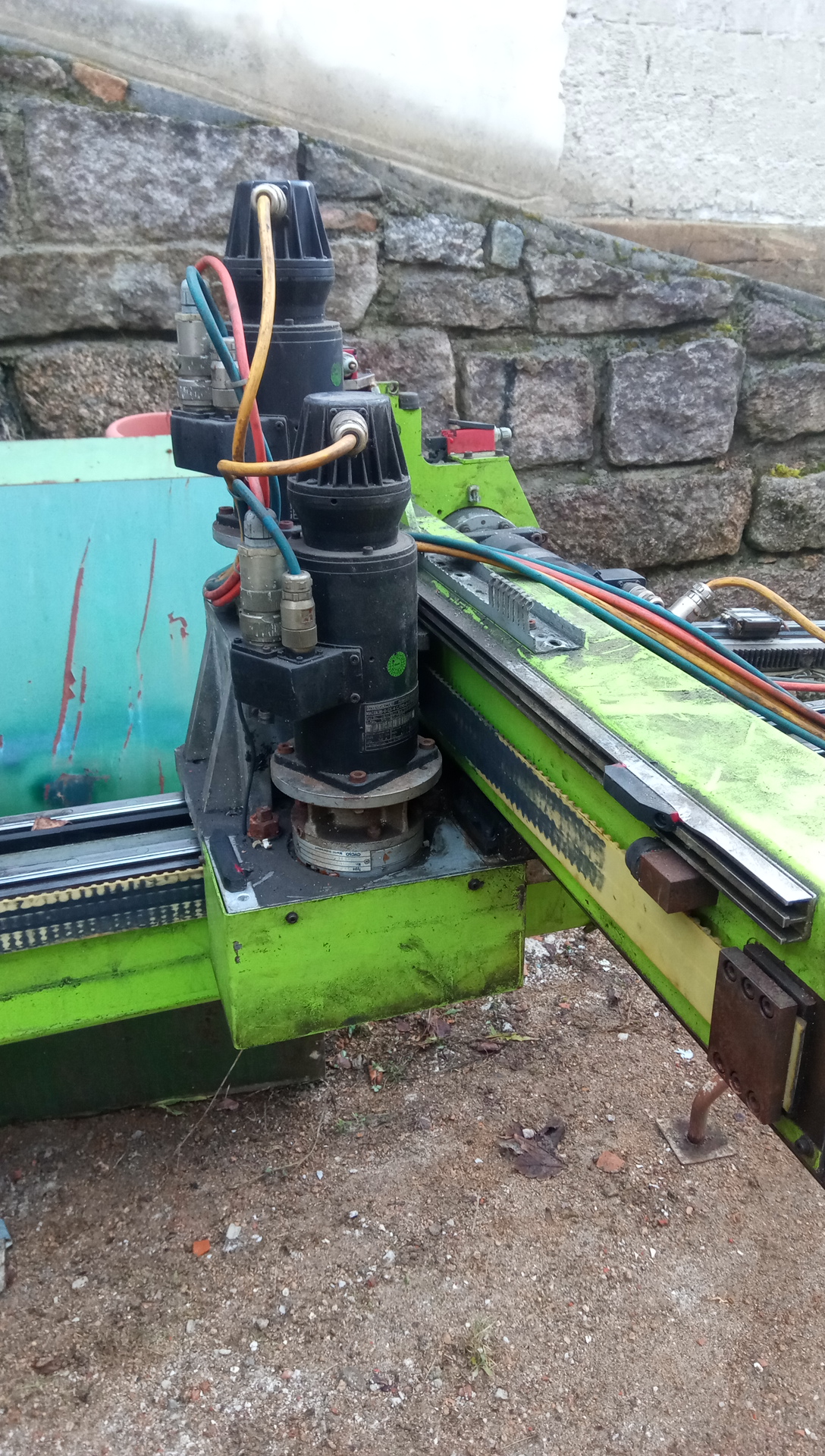 Celková délka hlavní osy je 3 metry, pokud si jí někdo rozpůlí má velmi dobrý základ CNC, nebo jde celá sestava použít jako základ laseru nebo plasmy, nemá totiž kuličkové šrouby ale ozubený řemen -> velká rychlost. Celek váží 300 kg. První 2 osy jsou ocelové profily, poslední je duralový, také nemá řemen ale přímo ozubený hřeben. Manipulátor má ťuklý konec 3tí osy (viz fotky)
