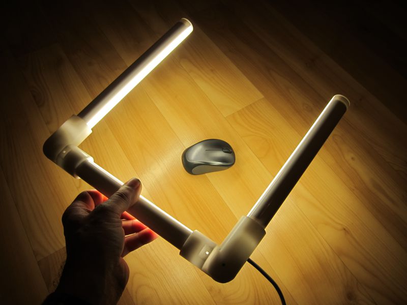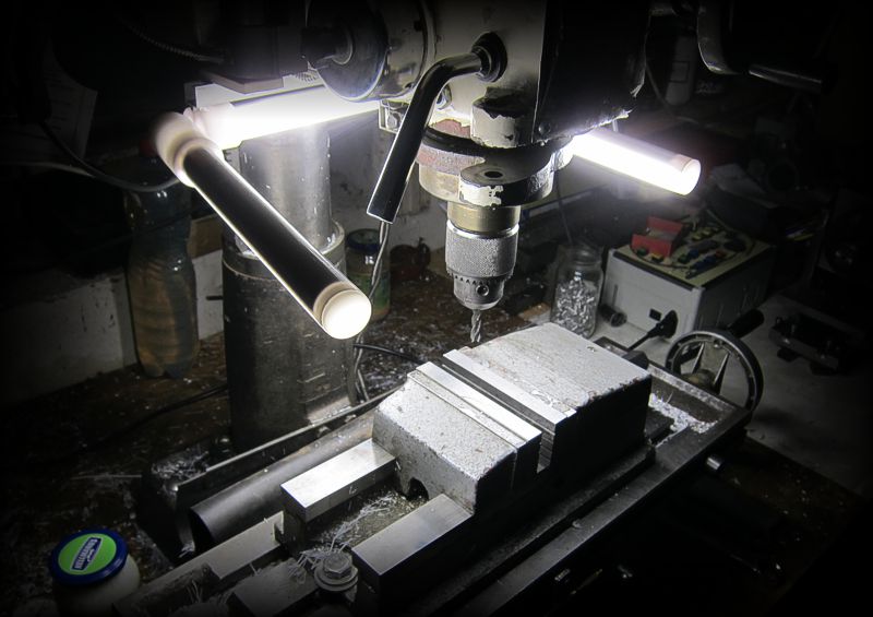 LED osvětlení na frézku. Za "oběť" padla jedna ledková trubice 150cm dlouhá, kterou jsem rozřezal a zkrátil cca na polovic. Klouby umožňují vyhnutí bočních ramen mimo prostor frézování.