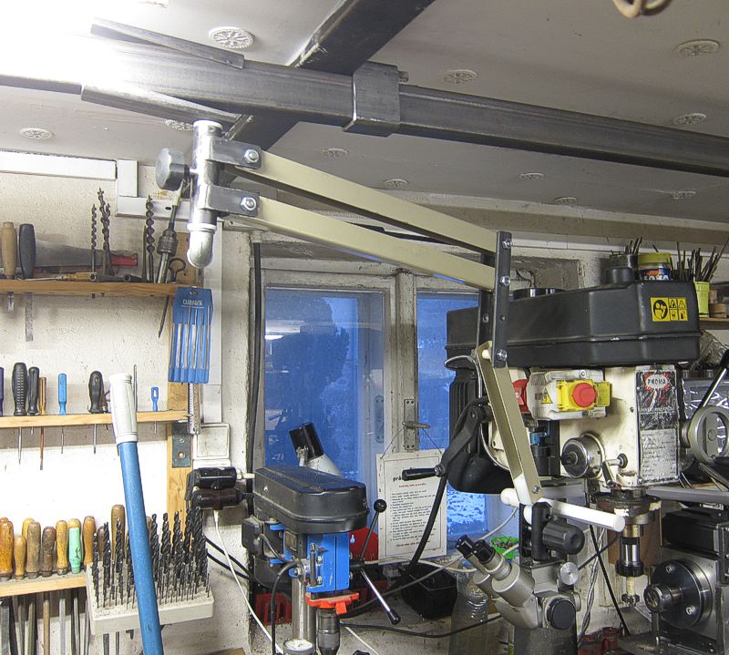 Zatím toho moc na ukazování není, je to ve fázi experimentů. Původně jsem tam chtěl udělat dvě dvojitá ramena, ale s tím už se špatně manipulovalo. Takže zůstalo jen horní dvojité doplněné plynovou vzpěrou z kufru auta, a spodní dvojité nahradilo jednoduché. Celé je to posazené, z důvodu odstranění chvění od strojů, na jeklu, který je přiklínovaný ke dvěma traverzám ve stropě. Na natáčení to moc není, přeci jen dost dlouho trvá, než se to přestane „houpat“, ale koukat se do toho dá. Materiál co dům dal, sešroubováno cca za jedno odpoledne.