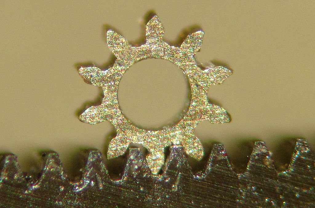 Ani ve výrobě kolečka nehledejte vědu, dělal jsem ho stejně jako ostatní kolečka. Na soustruhu jsem 5mm mosaznou kulatinu stočil na průměr hlavové kružnice a vyvrtal otvor 0,5mm. Pak to upnu do kleštiny odvalovačky, hodinkami srovnám házivost pod setinu mm. Kouknu do toho binokuláru a přijedu s odvalovací frézou na dotek. Nastavím zanoření na výšku zubu, spustím odvalovačku a pak už jen v tom binokuláru koukám jak se to hezky frézuje. Po odvalení vyndám a upnu do soustruhu. Do otvoru strčím tenký drátek, abych kolečko nehledal ve šponách a upíchnu to. Pak s tím chvíli šmrdlám na brusném kameni abych zabrousil otřepy. Držet se to nijak nedá, takže veškerá manipulace probíhá po napíchnutí na jehlu, broušení jen přimáčknutím prstu. Byl to opravdu jen pokus a zkouška možností, nic víc za tím nehledejte :D