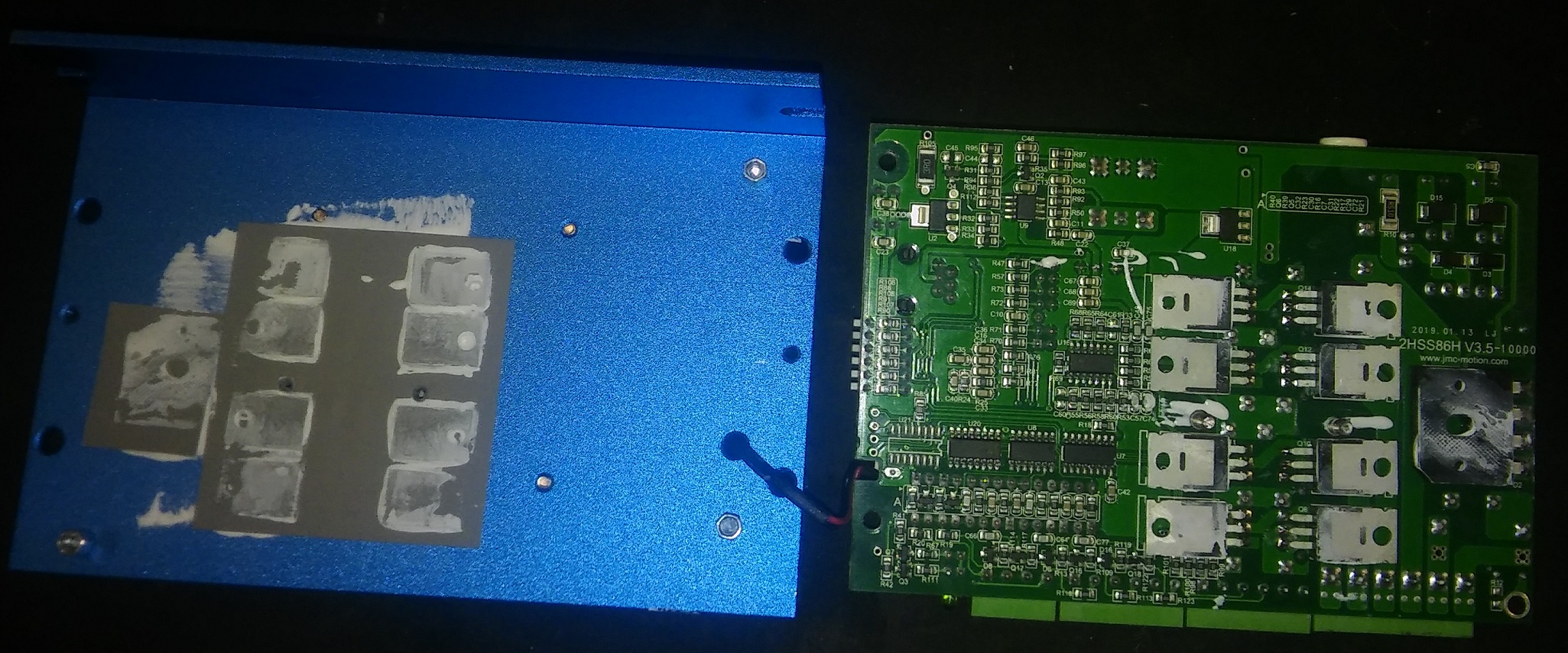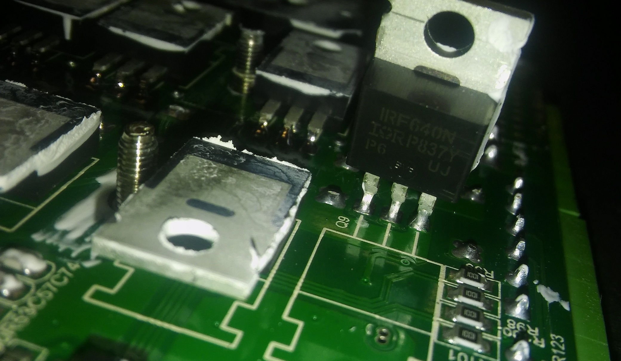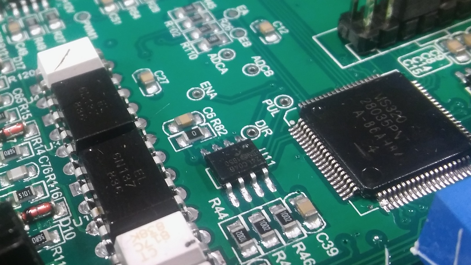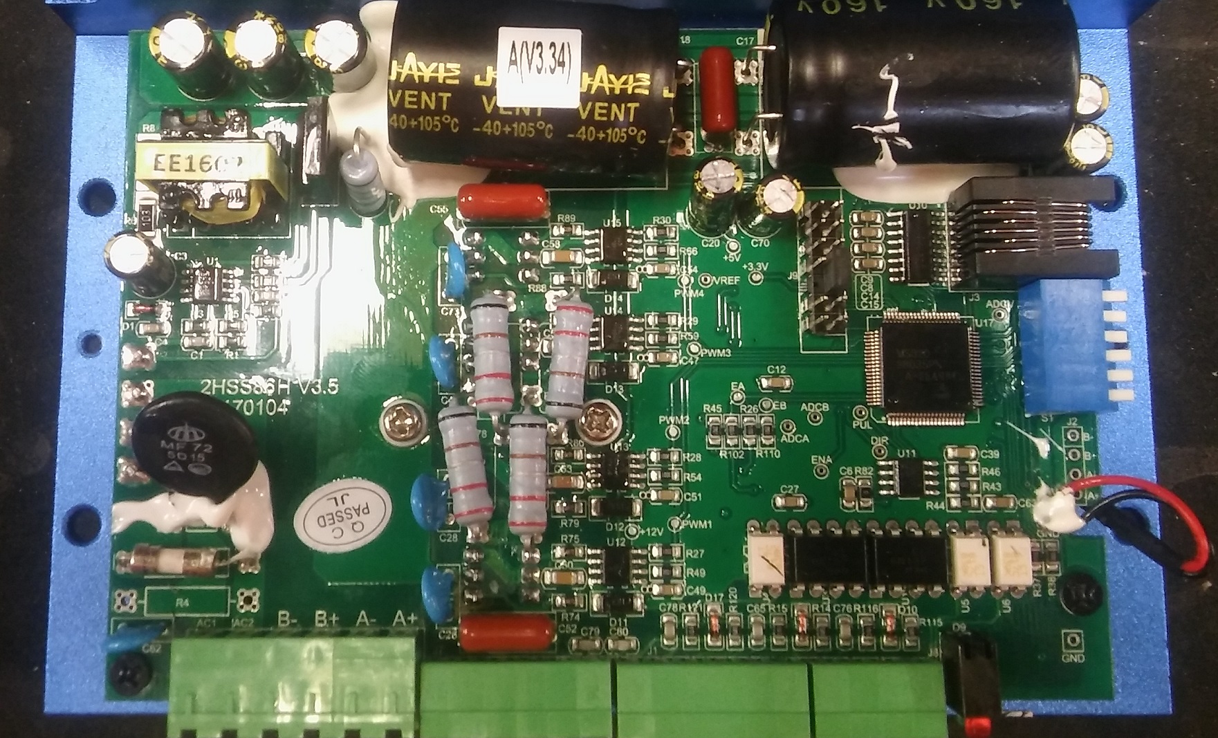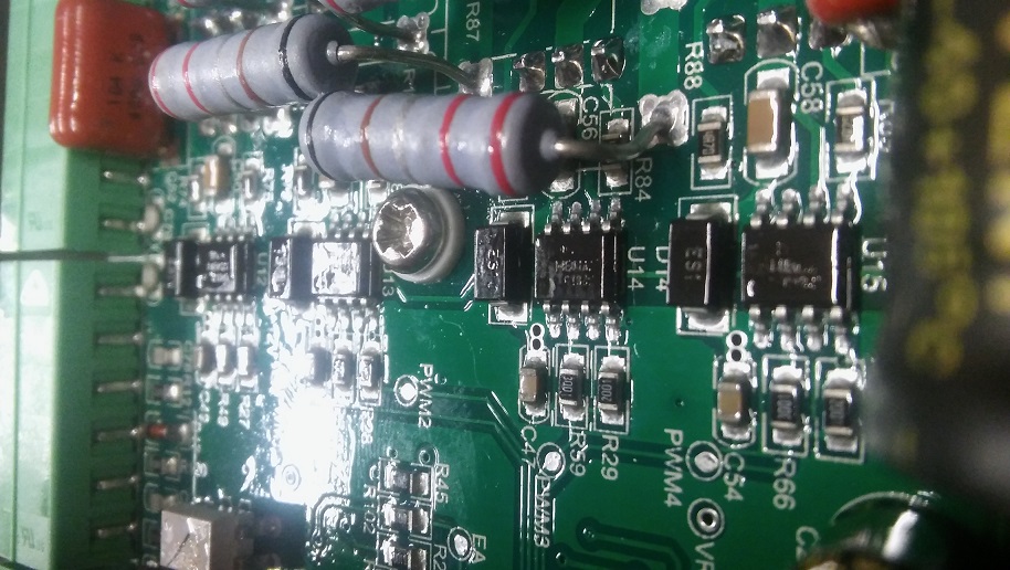 Nic moc zvlastniho, klasicke optrony 6N137, neznackove elyty, ale 8ks FETu je original IRF640N od Int.Rectifier. Ridi to DPS TMS320. Jsou tam slusne udelane ochrany vstupu, srazeci vykonove odpory, clamping externima Schottkynama, dale varistory, TVS. Jo a cele PCB ma conformal coating, to se jen tak nevidi!