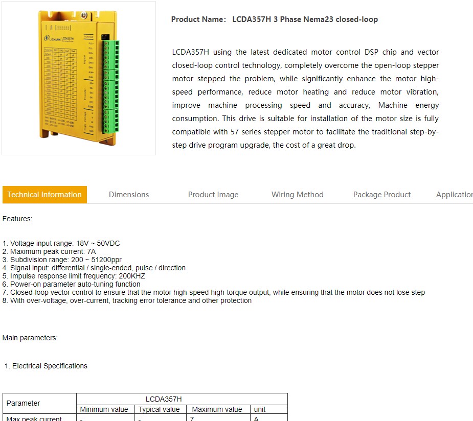 Ten LCDA357H je specifikaci a interfacem i cenou strasne podobny HSS86H (vyrobce Just Motion Control ), ktery uz nejaky rok pouzivam. Snad krome max. napajeciho napeti se ty dva na prvni pohled nelisi. Jeste existuje i stejne vypadajici HBS86H prozmenu od Leadhine, ktery je opet prakticky totozny driver.