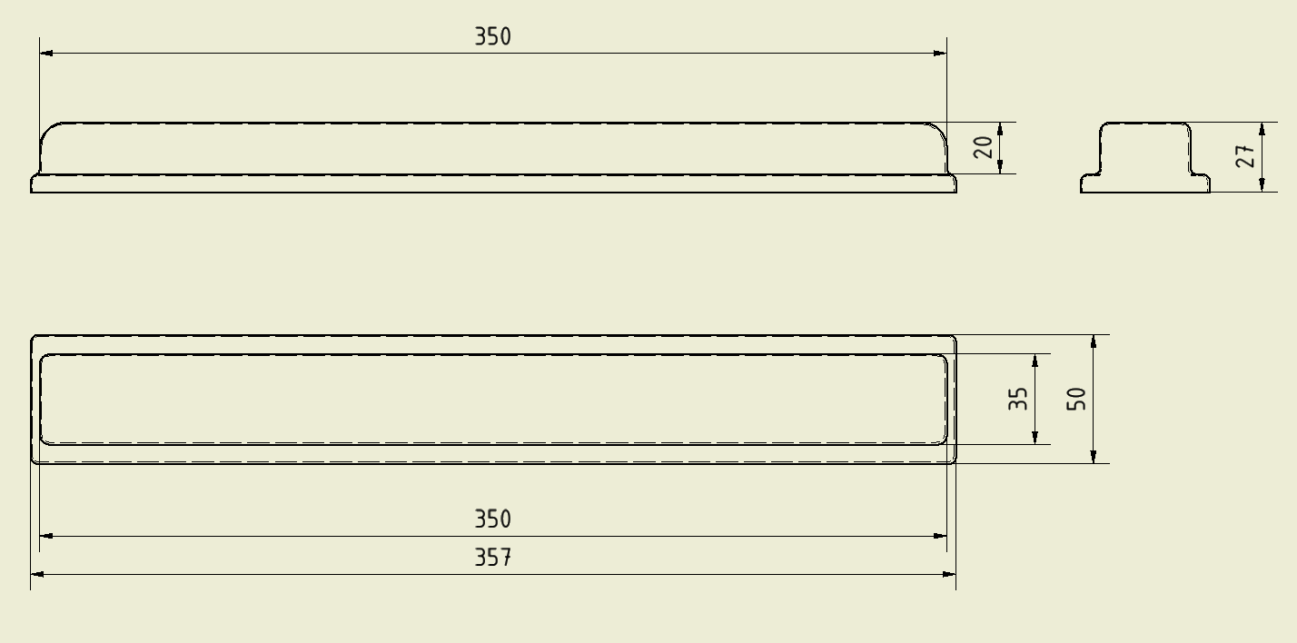 rozmery sú na priloženom "výkrese". rádiusy nie sú podstatné, môžu sa upraviť podľa potreby. spravil som nástroj, kde mám pridržiavač a chcel som ťahať ako prvý krok tú vaničku s rozmermi 20x35x350. polotovar mi vychádza cca 110x400mm. no a v rohoch mám veľké pretvárnenie materiálu, tak to nejde a utrhne mi dno vaničky.