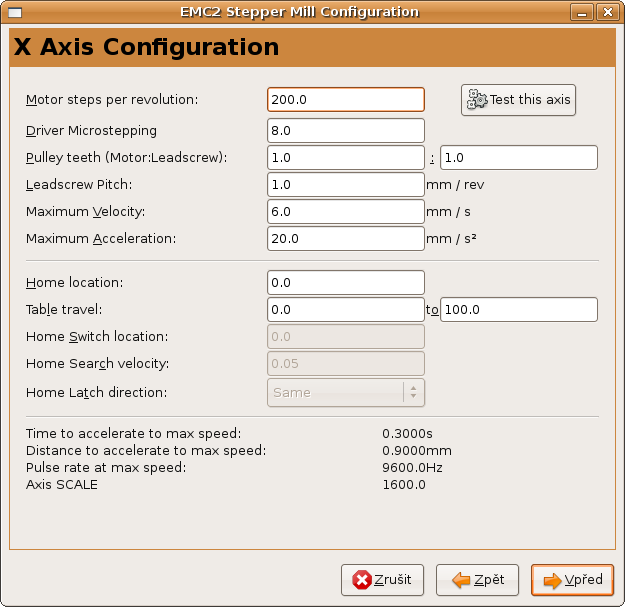 Když nastavuješ nový stroj tím grafickým průvodcem, tak tam zadáváš zrychlení pro každou osu zvlášť (plus rozsahy os, max rychlosti, kroků na ot,....)AcemanLB píše:lidičky vidina legálního softu na dílně mě překvapila a tak jsem se rozhodl pro linux s emc, ale nemáte někdo alepsoň trochu přeložený návod? Nevím jak nastavit motory aby se pomalu rozbíhaly. když si vyberu přednastavený stroj tak to jede (jen se to rozjíždí pro mou mechaniku moc rychle) a když to nastavím přes wizard stepper tak se motory ani nehnou. Stačilo by mi říct kde najdu úpravu stávajích parametrů tech přednastavených motorů. pls help.