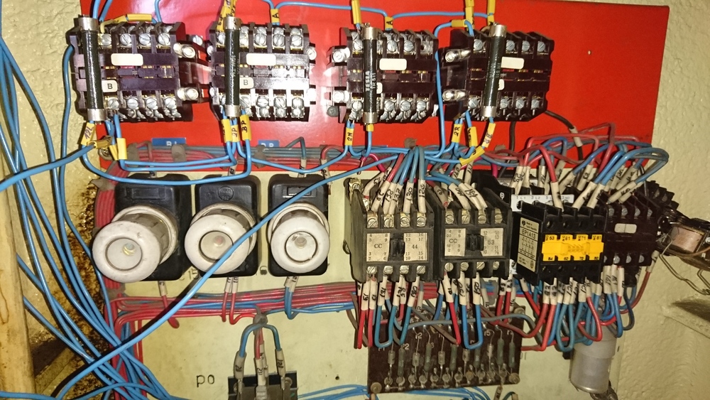 Tak jsem se do ni pustil a konečně jsem rozluštil ty prasečiny co v ní nadělali odborný elektrikáři za všechny ty léta. Rozvaděč je ve stavu, kdy se vyplatí ho výhledově vytrhat a dát nový, jsou vylámané svorky na stykačích a nic už neodpovídá dokumentaci. Dal jsem to do kupy tak, že makaj všechny posuvy i na rychlo, což předtim nefungovalo. Pro znázornění pár fotek z rozvaděče.