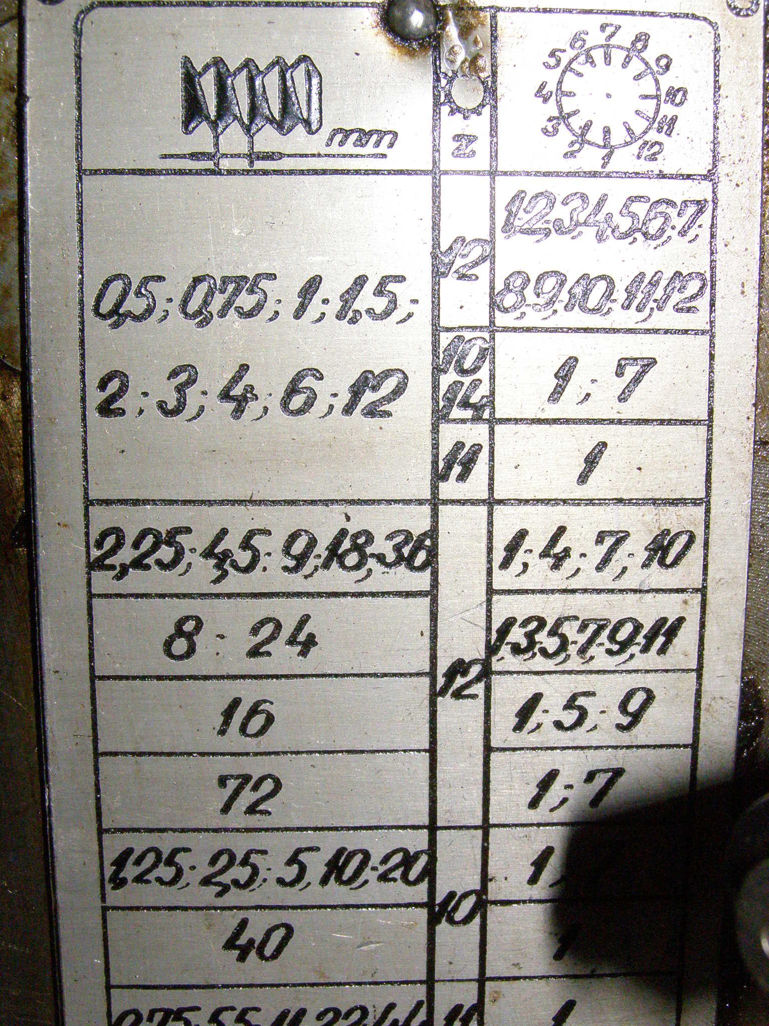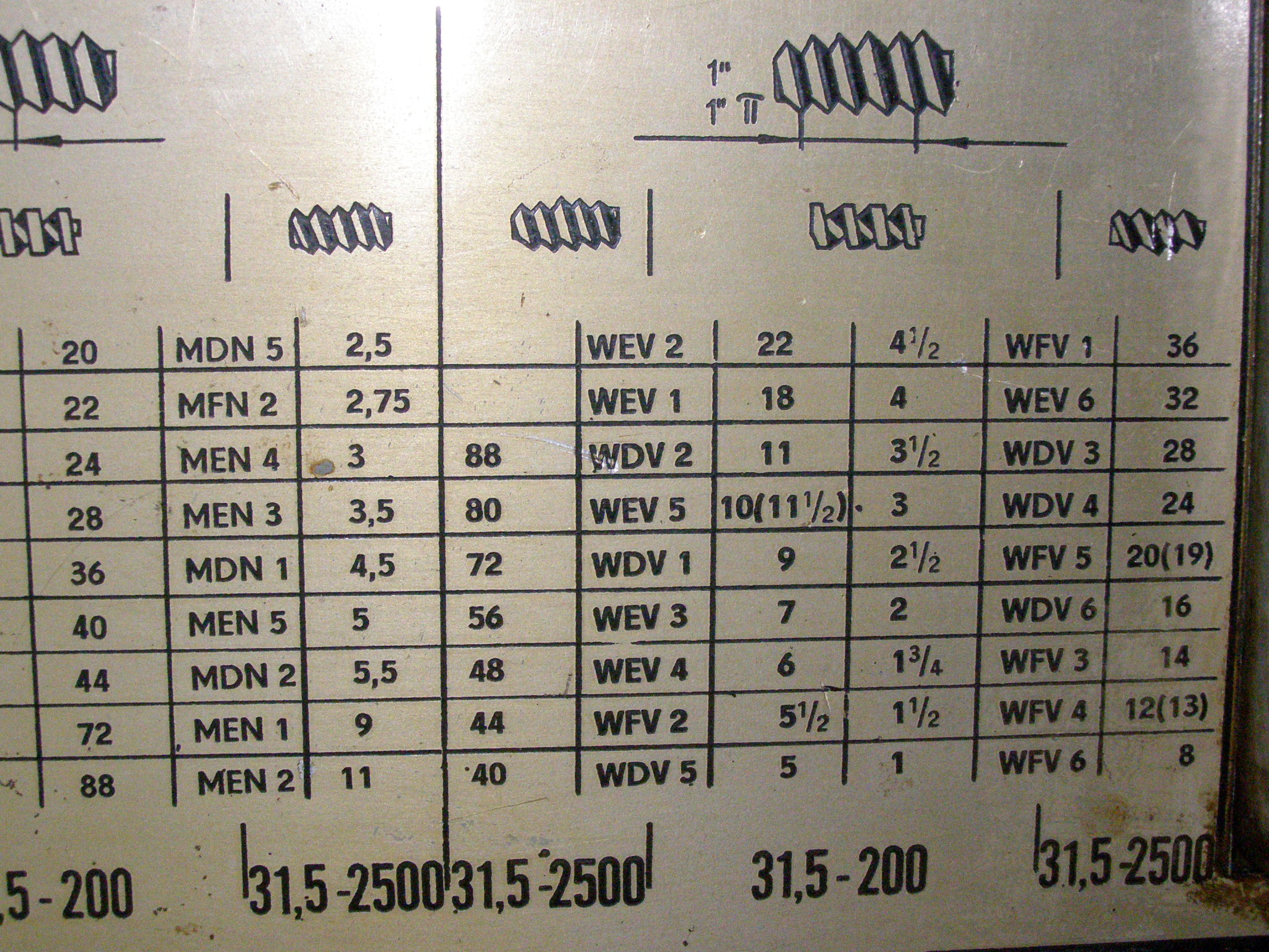Ta tabulka na suportu (druhé foto shora - PA170023.JPG) je pro závitové hodinky. Když se při řezání závitu vracíš na začátek k dalšímu průchodu, tak pro určitá stoupání můžeš rozevřít vodicí matici, abys mohl suportem rychle přejet. Ale při opětovném sevření matice potřebuješ právě tuto tabulku - závitové hodinky musí ukazovat některou s hodnot uvedených v pravém sloupci - pak máš jistotu, že se opět trefíš do závitu.