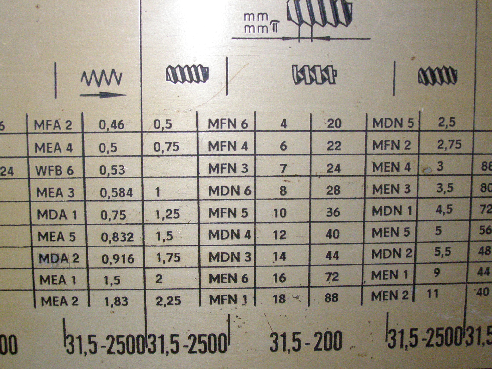 prosím o radu. Mám uvedený sústruh a na nom sú tabulky /foto prilohy/. Chcem sa opýtať, čo presne znamenajú. Predpokladám, že ide o nastavenie posuvov pri sústružení a pri rezaní závitov. Nastavuje sa to zrejme s tými páčkami. NA páčke označenej M a W, znamenajú tie písmená M - metrický a W - withvorth? Co znamenajú tie grafické symboly? Ako by som mal nastaviť tie páčky, ak by som chcel rezať napr. metrický závit M10?