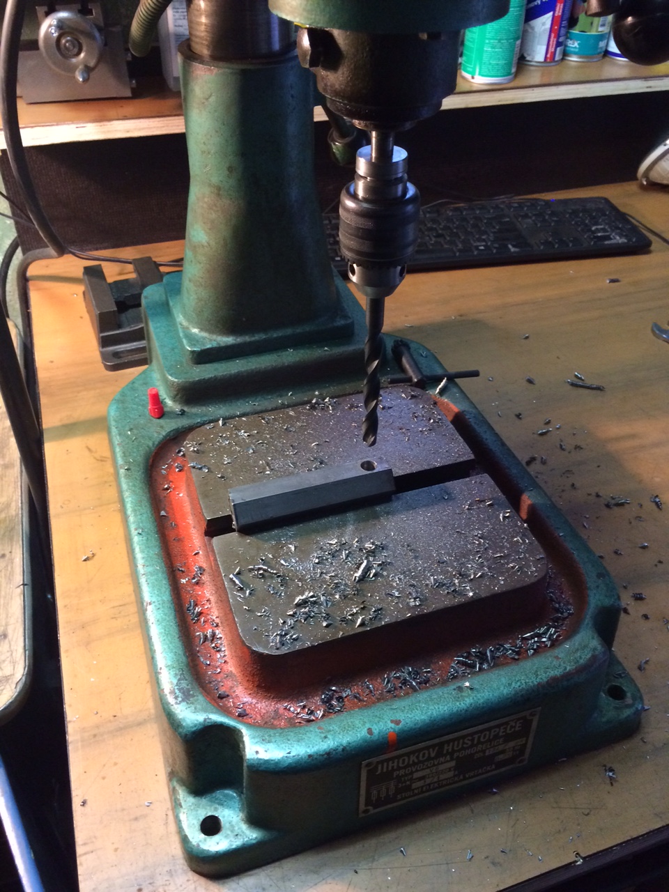 Já tuhle vrtačku Jihokov V6 mám, V6 znamená, že tam patří sklíčídlo na vrtáky max. 6 mm. Mám ve vrtačce udělanou jinou hřídel, na hřídeli kužel B16 a sklíčidlo 1,5 až 16 mm, zdárně to tak používám, otáčky jsou v pohodě,ona má celkem velký rozsah, jen toho místa mezi vrtákem a stolem není mnoho, ale zase jde otočit vrtačku a vrtat mimo stůl.