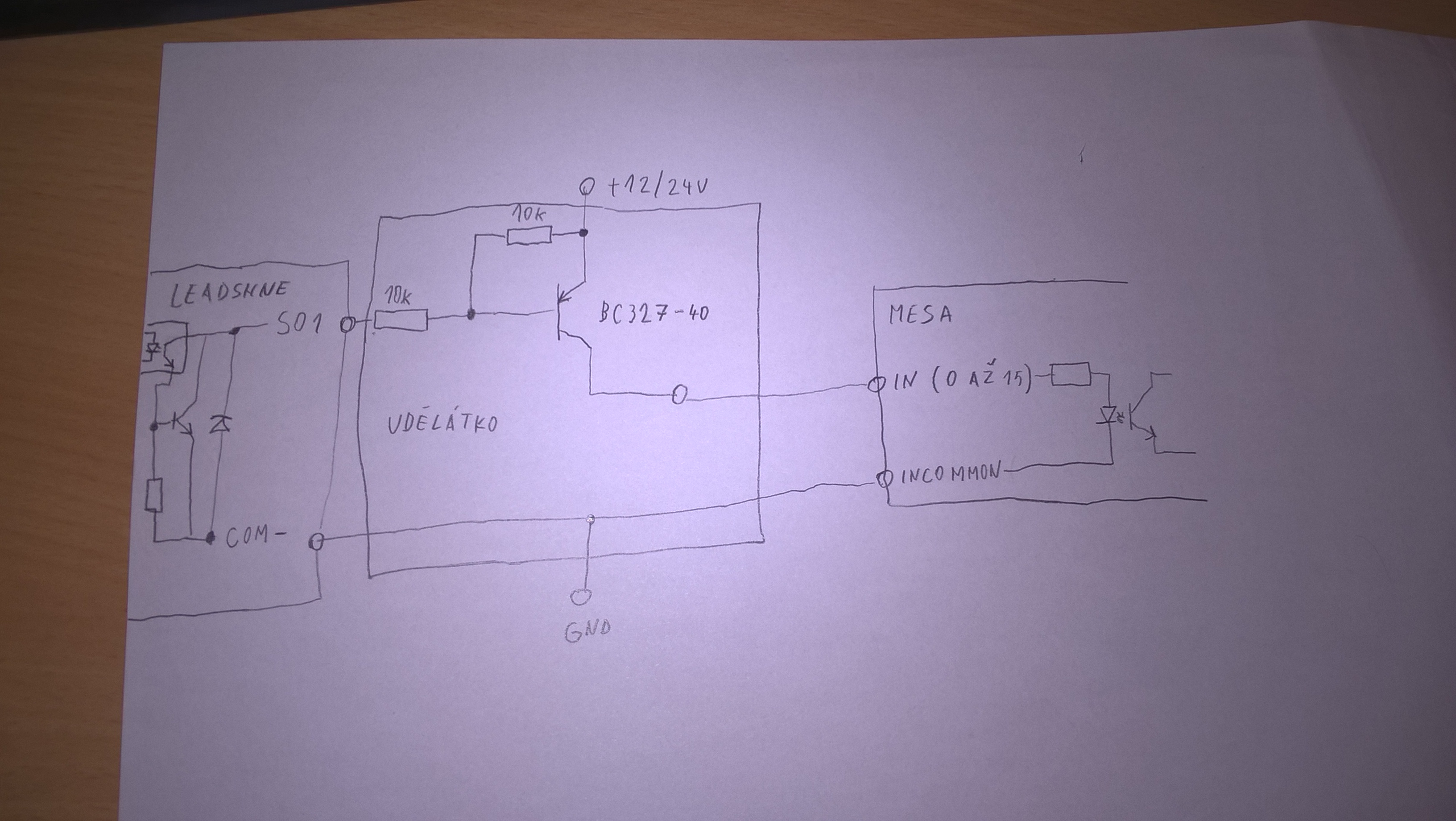 Tady je trochu nešikovné, že ten driver má výstup typu NPN, ale Mesa 7i37 má vstupy typu PNP.