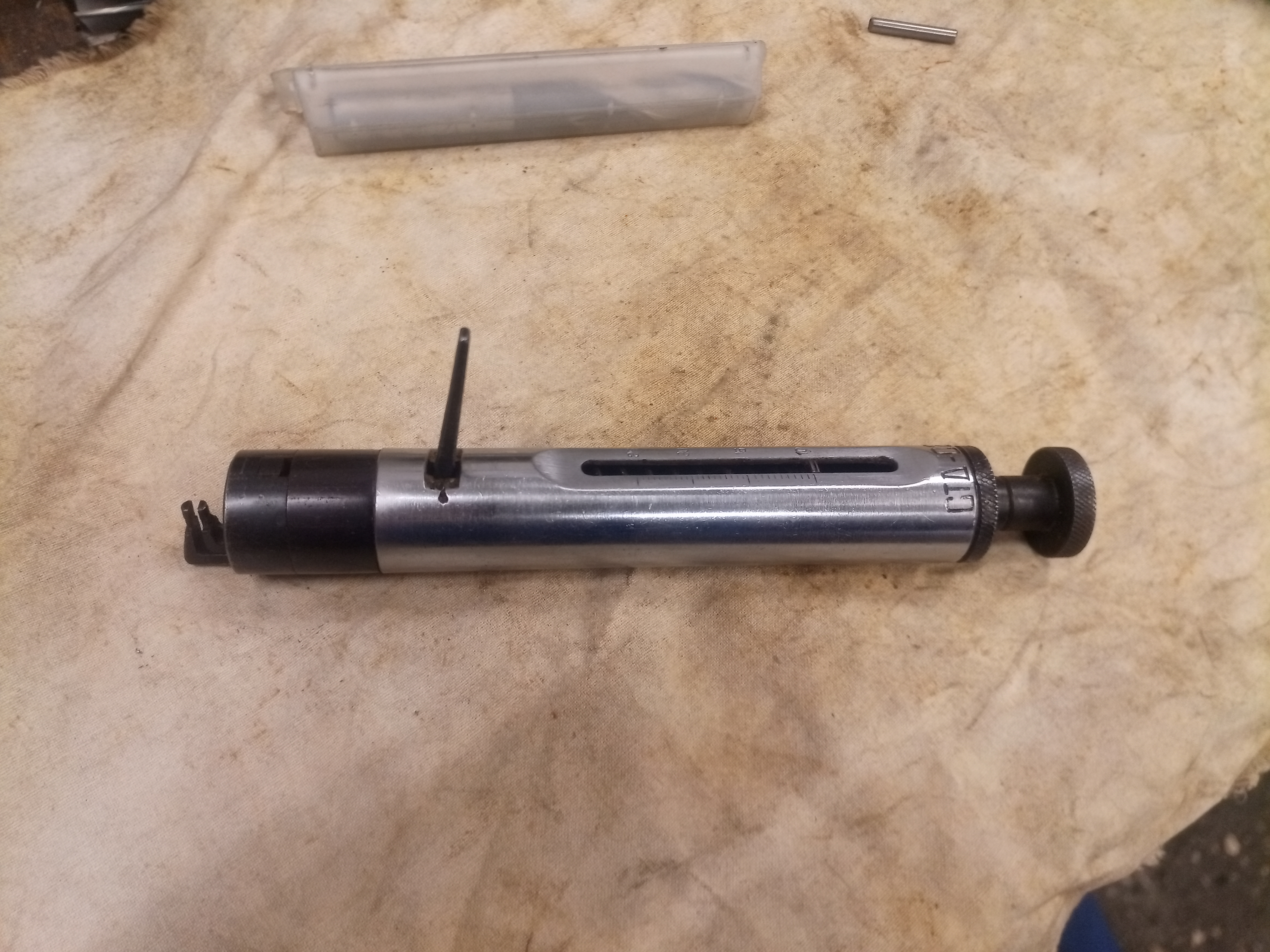 Tohle je siloměr, který se používá na měření síly kleštin ve skřipcovém stavu. Strčí se to v sevřeném stavu do toho kulatého otvoru skřipce a kontroluje, jakou silou jsou kleštiny, co drží útek (tu nit) tisknutý k sobě. Pokud je síla slabá, musí se na těle skřipce vpředu roznýtovat dva nýty a kleština vyměnit. Tohle je konkrétně siloměr k ruským stavům STB.