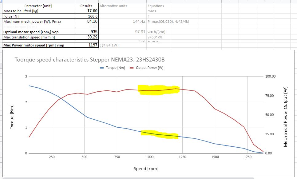 Je tam i identifikace tech dvou pracovnich bodu mezi kterymi by se idealne ten krokac mel pohybovat nejvice casu v zatezi. Tady to bylo 935rpm resp. 1197rpm. Jak jsem psal, ten dynamicky test bezel na saturovane rychlosti 5500mm/min, coz s 5mm sroubem oodpovida 1100rpm, tedy z hlediska pohonu idealni setup.