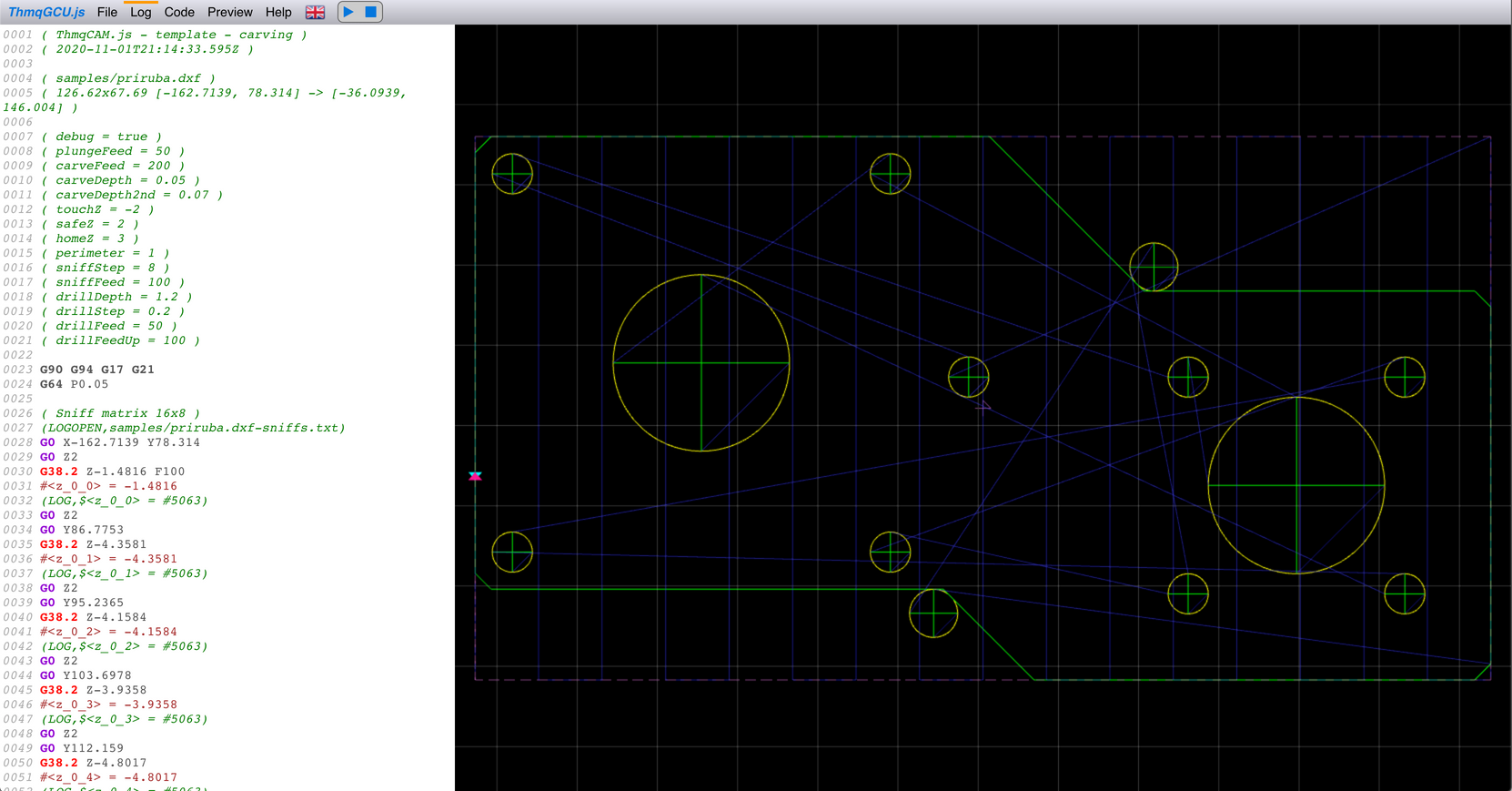 Konvertor načte předlohu (DXF, tady skeč z F360), z rozměrů vymyslí matici, postupně jí na začátku programu očuchá a hodnoty uloží do proměnných (zároveň se hodnoty logují pro případ nějaké nehody, kdy už je deska napůl rozvrtaná, atp.). Pak vygeneruje gravírovací kód viz. výše, hodnoty Z jsou počítané z proměnných daného polygonu, koeficienty jsou předpočítané pro polohu bodu v tomto polygonu, např. G2 X-109.8728 Y143.6329 Z[0.6771 * #<z_7_8> + 0.0426 * #<z_6_8> + 0.2802 * #<z_6_7> - 0.05] I-0.1001 J-2.498). Mrkněte na ty videa, je tam vždy i záběr na kód.