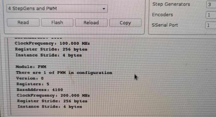 Máš v MESA kartě správný firmware, který umí PWM? Zkus co Ti vypíše: