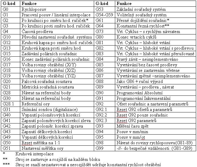 V prilozene tabulce je prehled G prikazu, ktere podporuje Mach