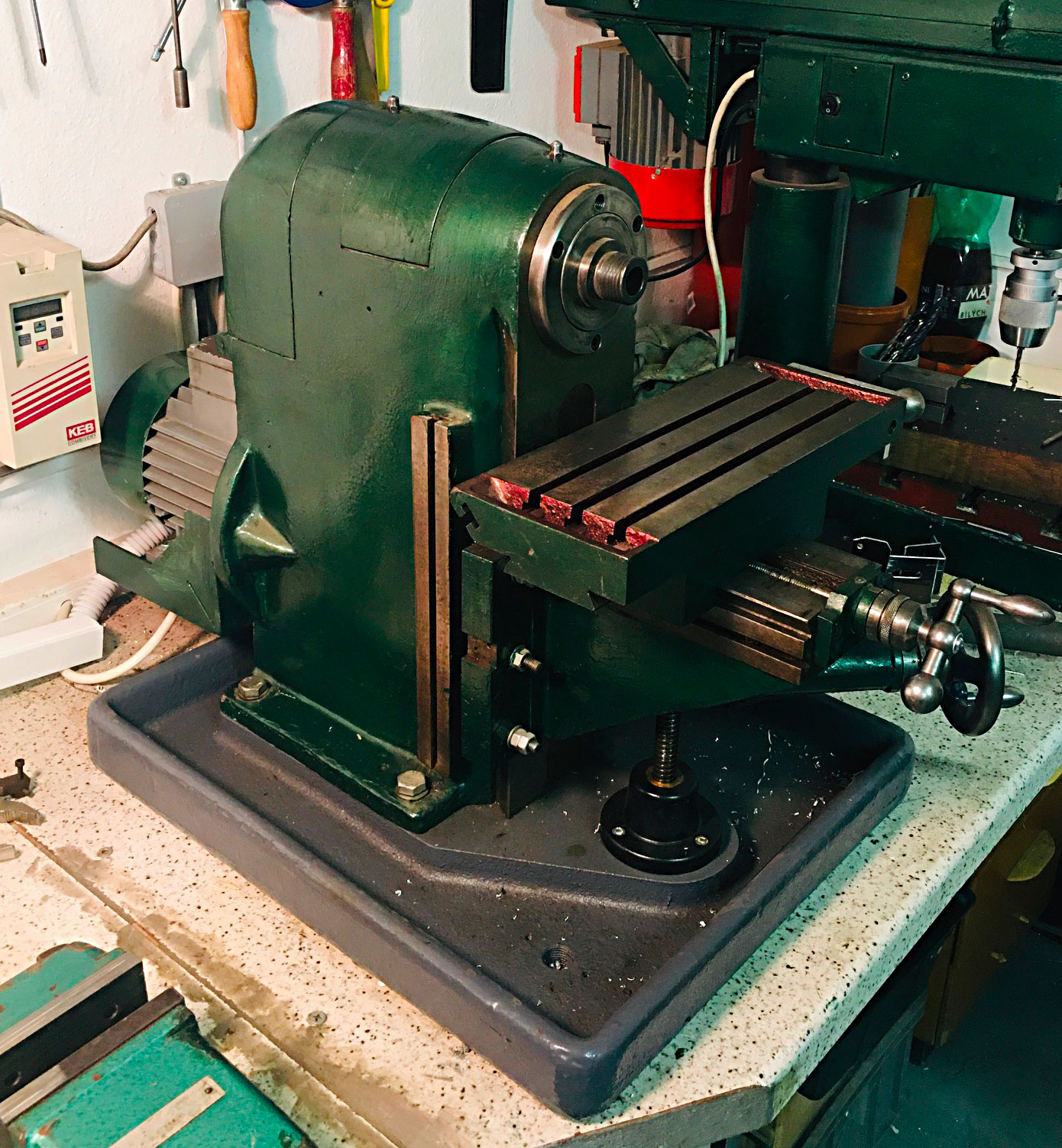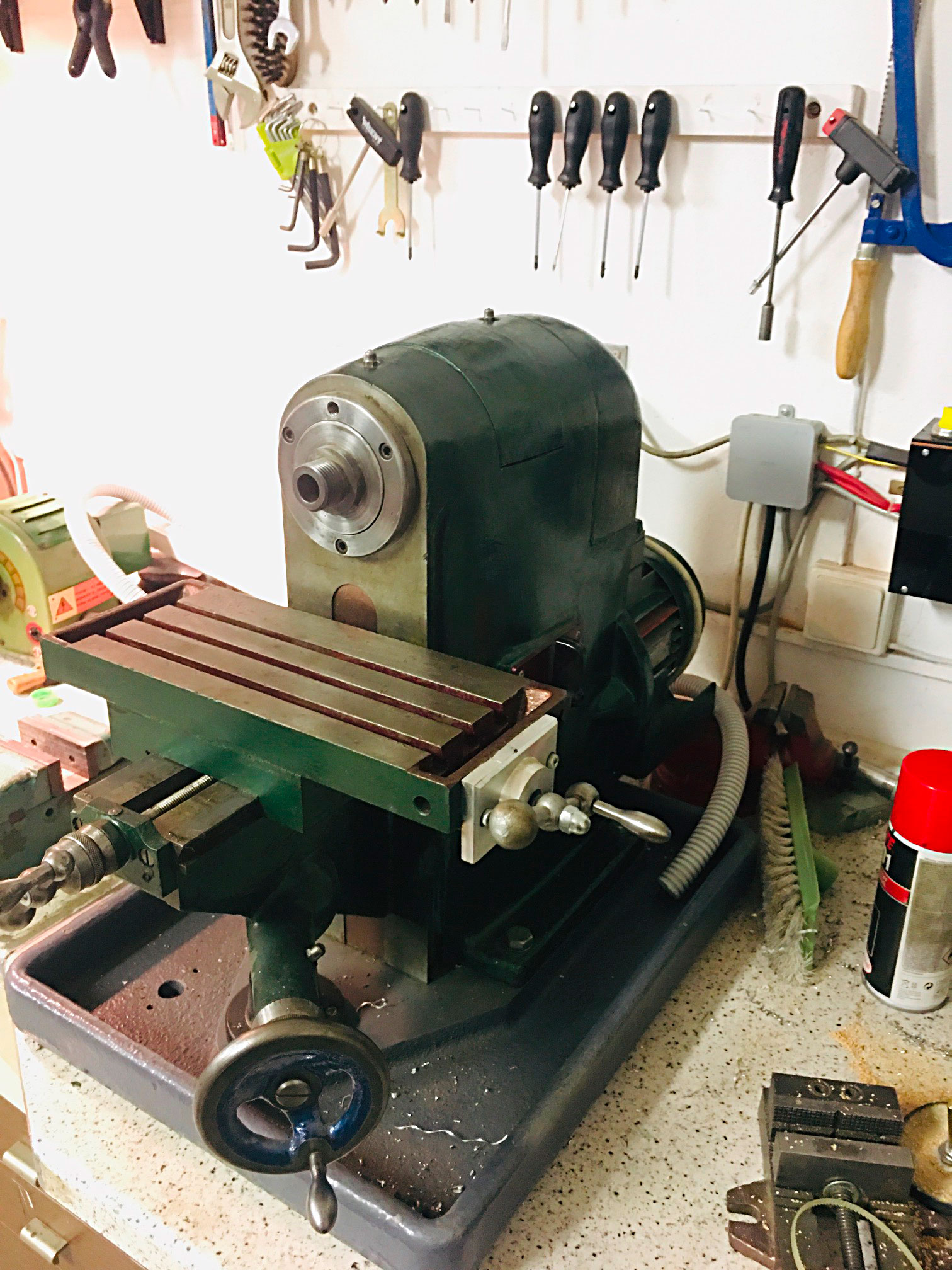 Prodám malou stolní frézku. Původně to měla být sestřička BF20. Když jsem si ale pořídil FN20, tak horizontka pro mě nemá smysl. Typ nevím a štítek neměla, když jsem ji koupil, měla osu X na páku. Mašinka je významně zrekonstruovaná. Vřeteno nová ložiska, stroj kompletně rozebraný a vyčištěný. X osa předělaná na kličku a trapézový šroub a udělán držák motoru + novej motor. (původně tam byl dlouhý řemen a motor pod stolem) Vřeteno má kromě závit morse kužel 2. Stroj nemá prakticky žádné vůle a lze okamžitě používat. Motor je přepnutý na 3x220V a momentálně je připojenej k měniči. Žádné příslušenství kromě vtahovacího šroubu k ní není. Rozměry 500x400mm, výška 500mm. Váha dost přes 100 kilo. Pevná cena 25000,- Kč. Na spoustě míst je vidět původní zaškrabávání. Ono taky ve škole v dílnách moc seriové výroby není.