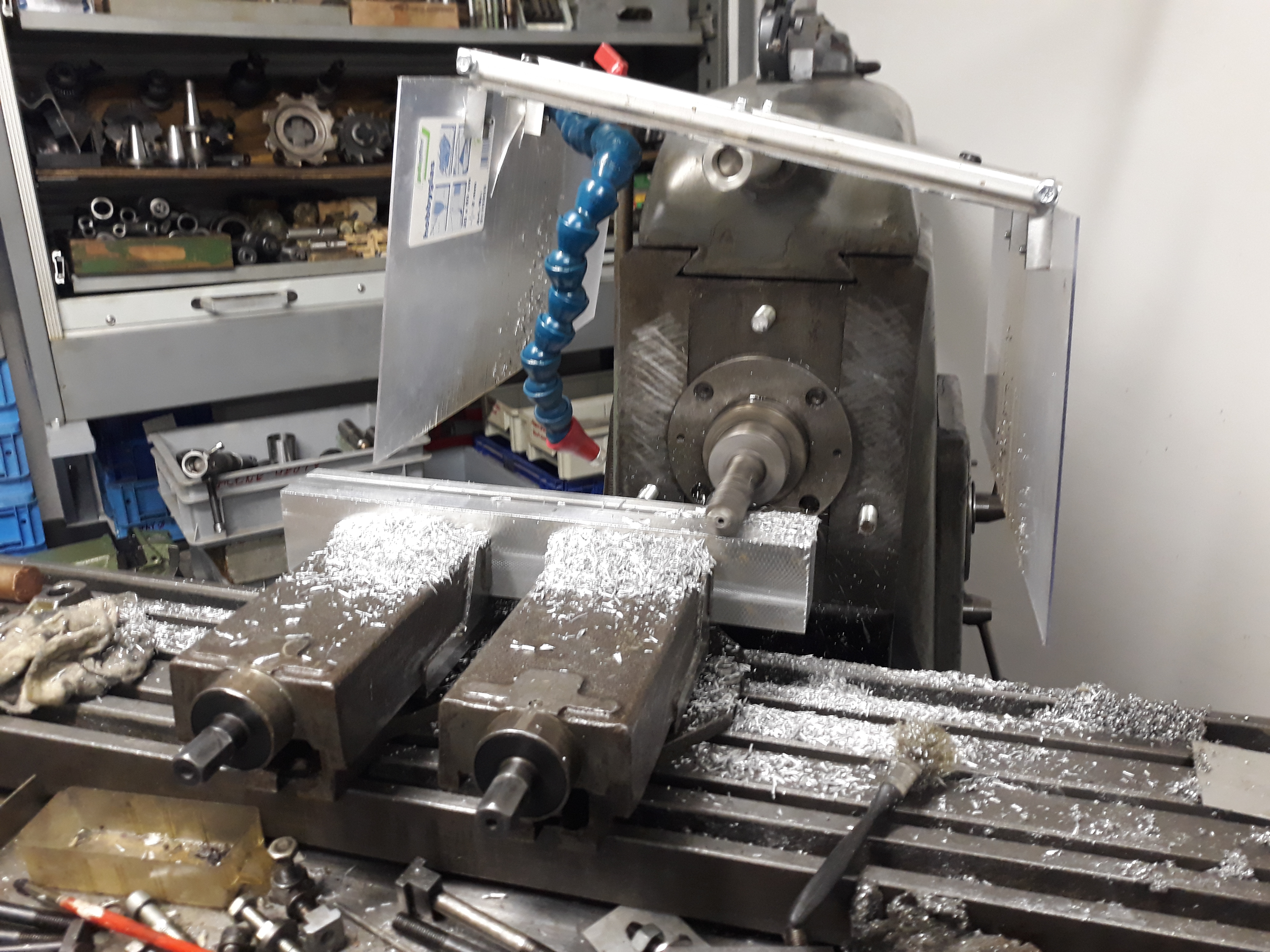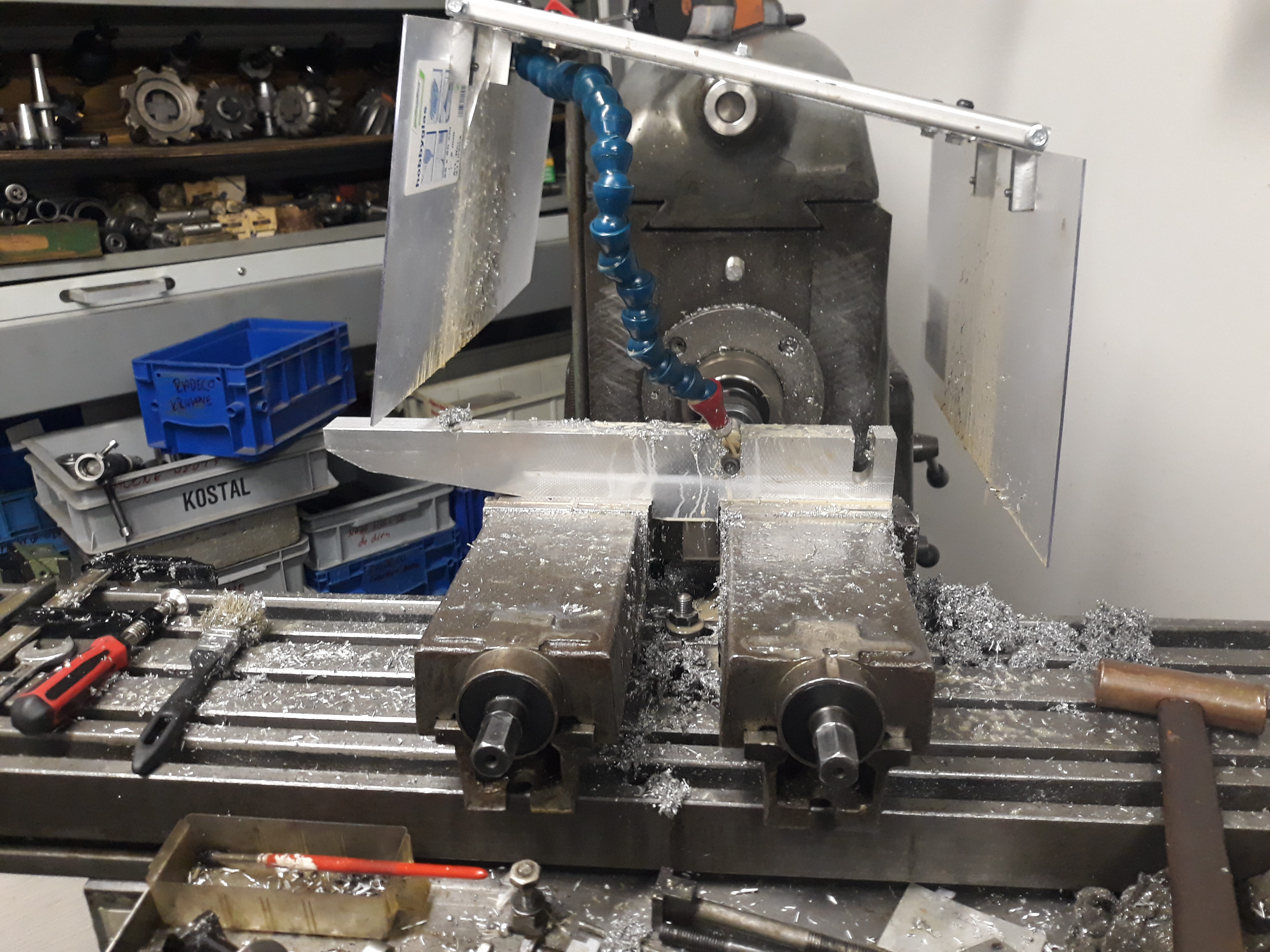 Ale byla to docela sranda škrábat tam 3mm frézou vyloženou 35mm z kleštiny. Dost dobrý cvičení na různorodost chování 1-2-3břit, taky fréz různých výrobců, ladění optimálních řezných podmínek...