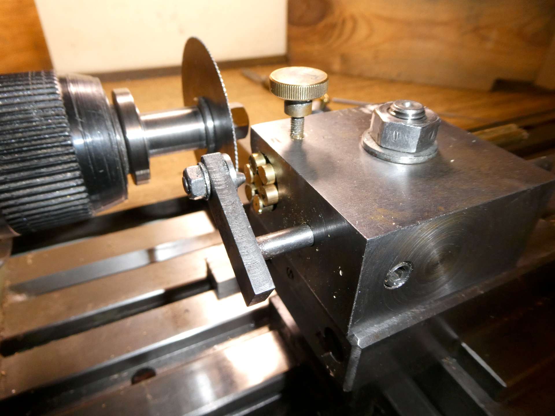 Do kleštinového upínání je dobré mít doraz dovnitř kleštiny. Kleštinový klíč má k tomu v hlavici závit. Abych nenajel nožem do upínacího zařízení, viz doraz na loži v mých předchozích příspěvcích. Tím se umožňuje i pracovat s co nejmenším vyložením obrobku.