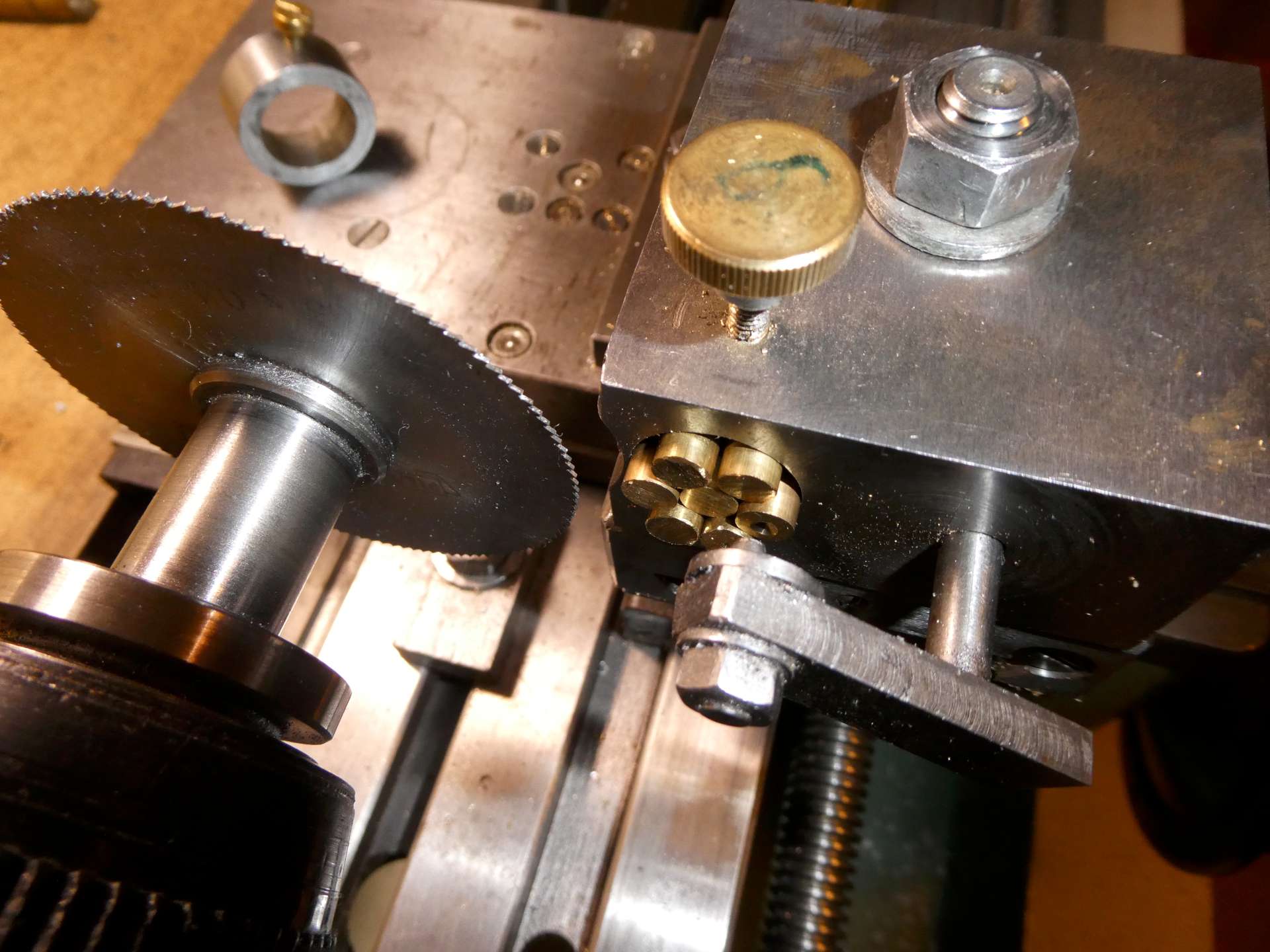 Namísto upichování raději používám kotoučovou pilku (0,4 x 63), zejména při větších seriích. Pro použití pilek mám kleštinové trny s redukčními kroužky na různé velikosti. Trn má 10 mm a závit M 10 x 1.