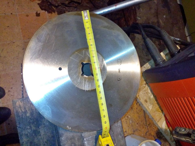Takhle, myšleno rotačně, se trubky řezali v místních papírnách. Teď už tam stojí obchoďák, podařilo se mi přes známého zachránit alespoň ty řezné kotouče. Trubky řežu příležitostně v objemu řádu igelitky, a tak se mi nevyplatí na to něco jiného vyrábět.