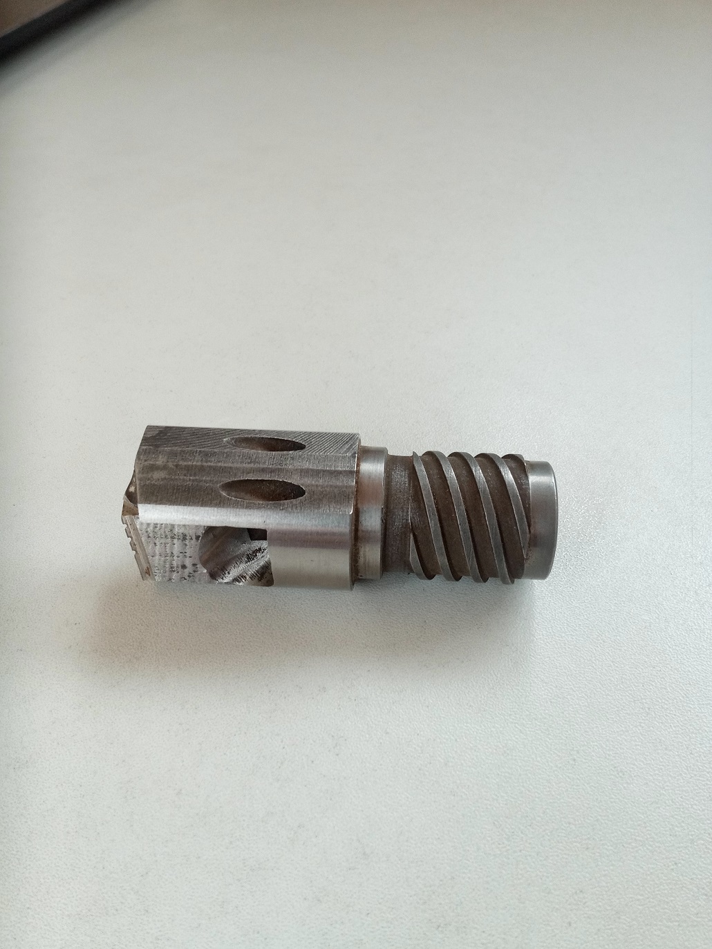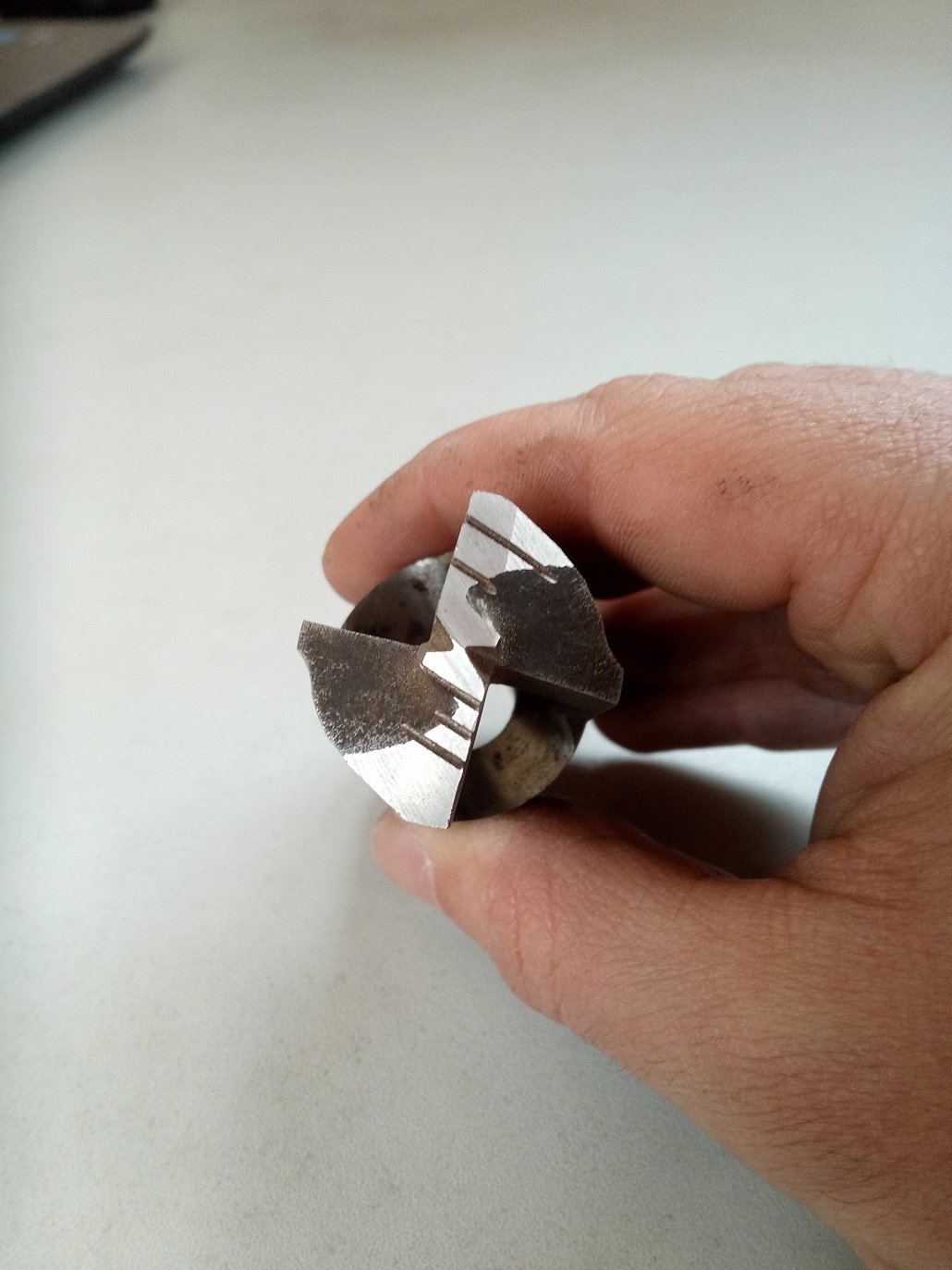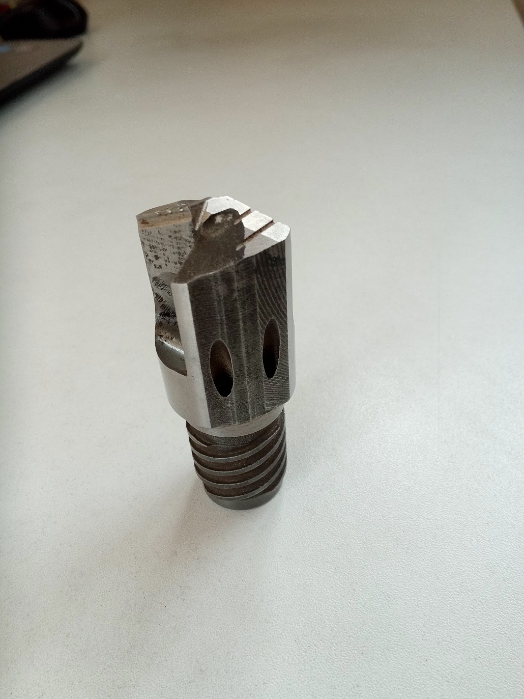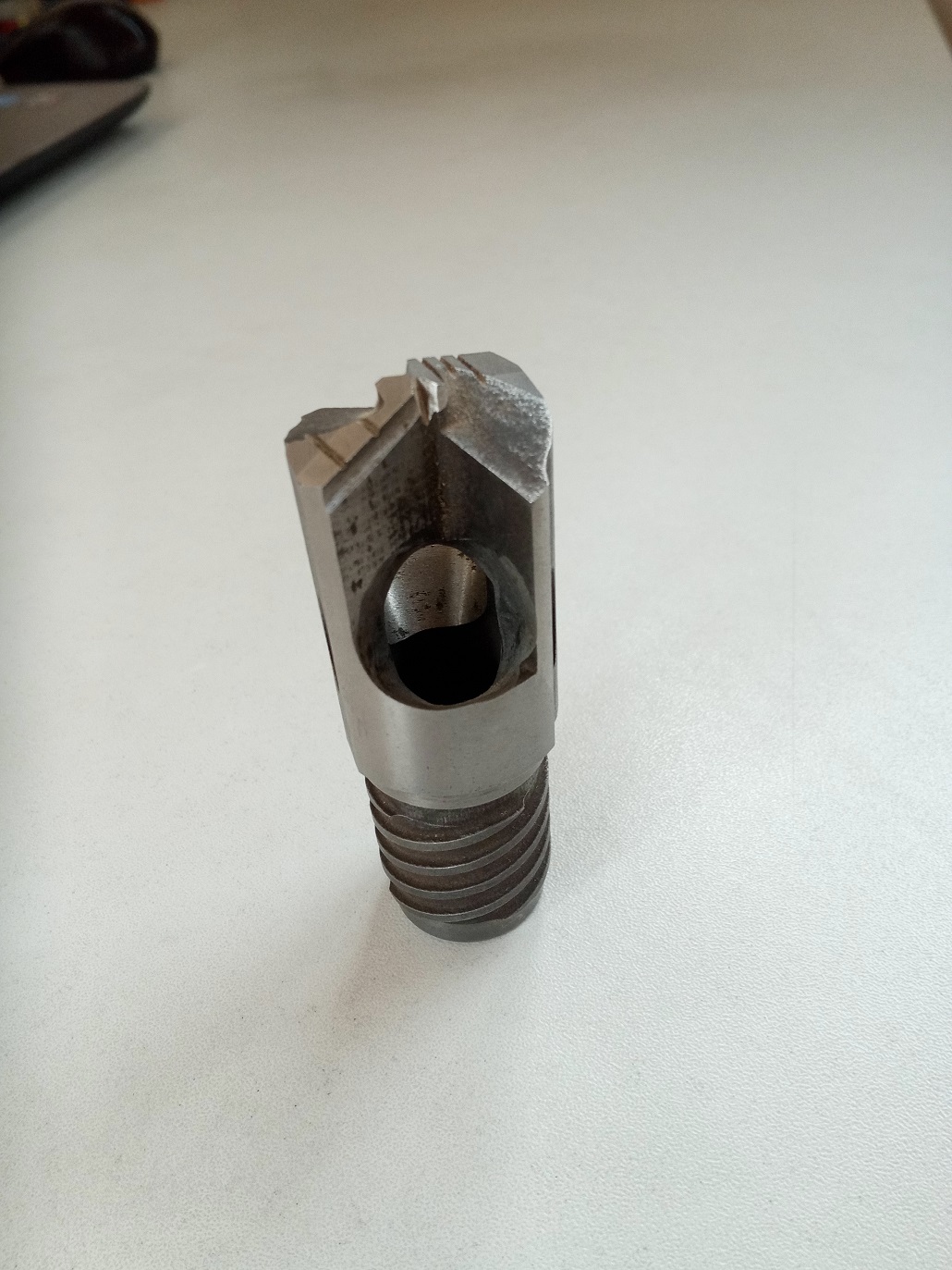 Ja ale delový vrták nemám, má normálne symetrické ostrie, akurát nesymetrický lámač špony, aby sa špona zbortila do vnútra vrtáku. Celá hlavica má presný priemer 30mm a celá hlavica slúži ako vedenie - okrem časti kde sú vyvedené diery na prívod kvapaliny. Na fotke vnútra je vidieť chladiace diery a osadenie na vnútorný plášť pre špony. Zo spodu štvorchodný závit.