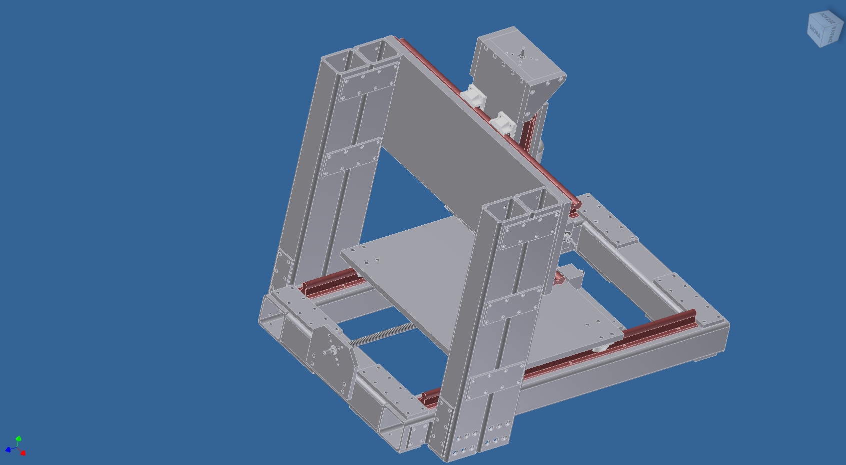 Materíál rámu- ocelový, průřez 80x80x5 spodní rám a 90x70x5 sloupy portálu, desky osy z budou duralové kvůli snížení hmotnosti.Celková hmotnost mi teď vychází kolem 140kg +vřeteno, km ...