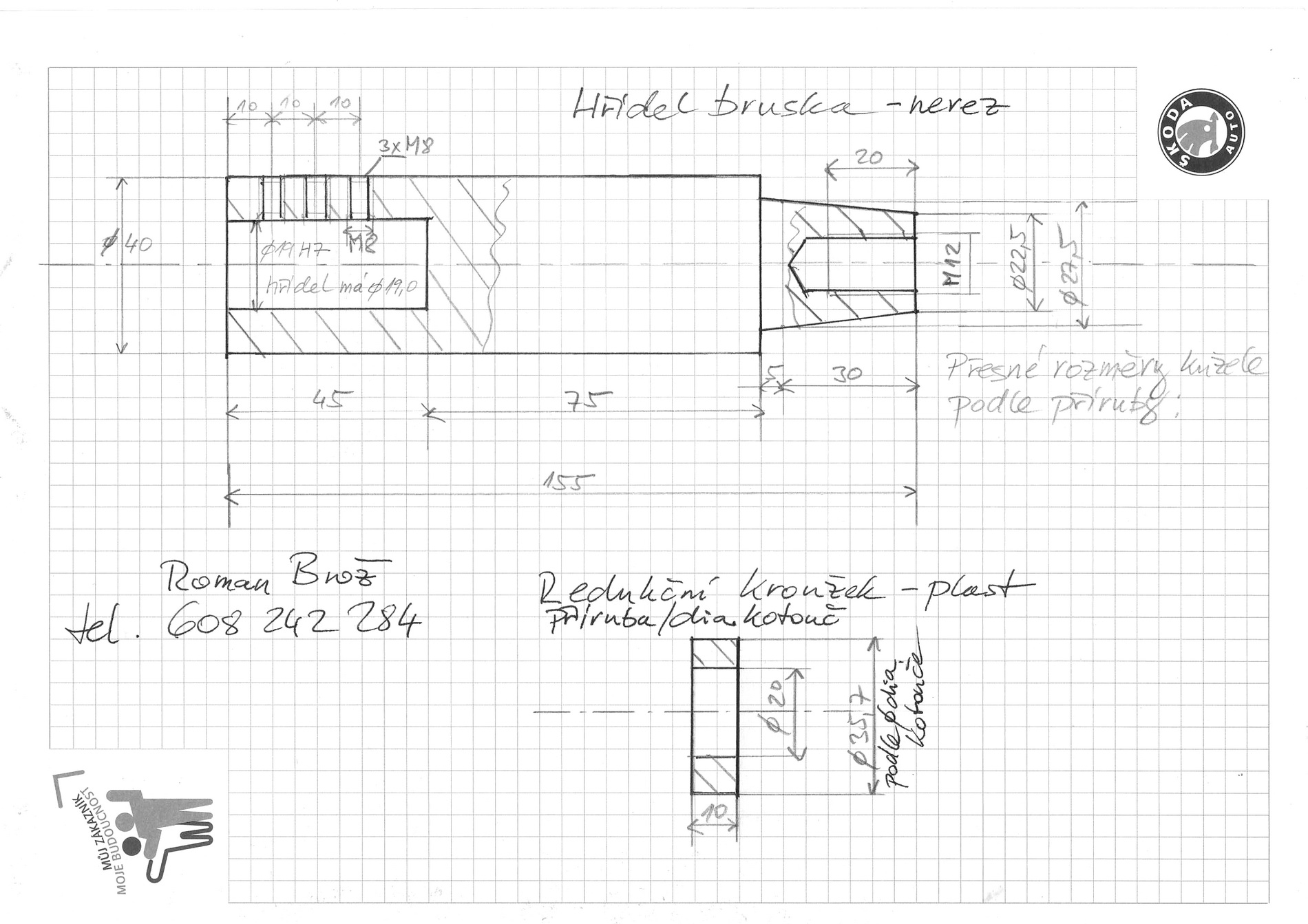 hledám soustružníka, který by vyrobil hřídel z nerezu podle přiloženého výkresu. Materiál mohu dodat vlastní. Hřídel bude propojovat elektromotor s přírubou (na fotografii, mohu zapůjčit ke změření). Průměr hřídele motoru je změřený mikrometrem. V přírubě bude upnutý ocelový brusný kotouč (kotouč má bronzovou vrstvu s diamanty). Celé je to určené k broušení minerálů. Protože je brusný kotouč (průměr cca 33cm) starý, orezlý a hodně těžký, tak bych chtěl také srovnat jeho tvar (toho ,,železa") a ztenčit jeho tloušťku ze současných 30mm na 25mm.
