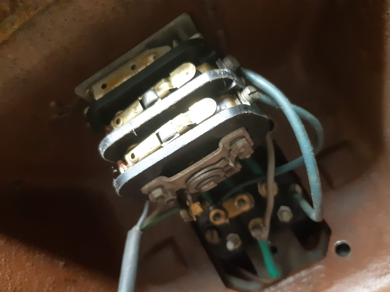 Tak bruska už se točí. Jako správný vědec jsem udělal dvě věci najednou a spravilo se to. Vyměnil jsem drátky, protože u starých už opadávala izolace a na spínači jsem prohodil fáze (nevím jestli se tomu u jednofáze tak říká...prostě jsem prohodil drátky