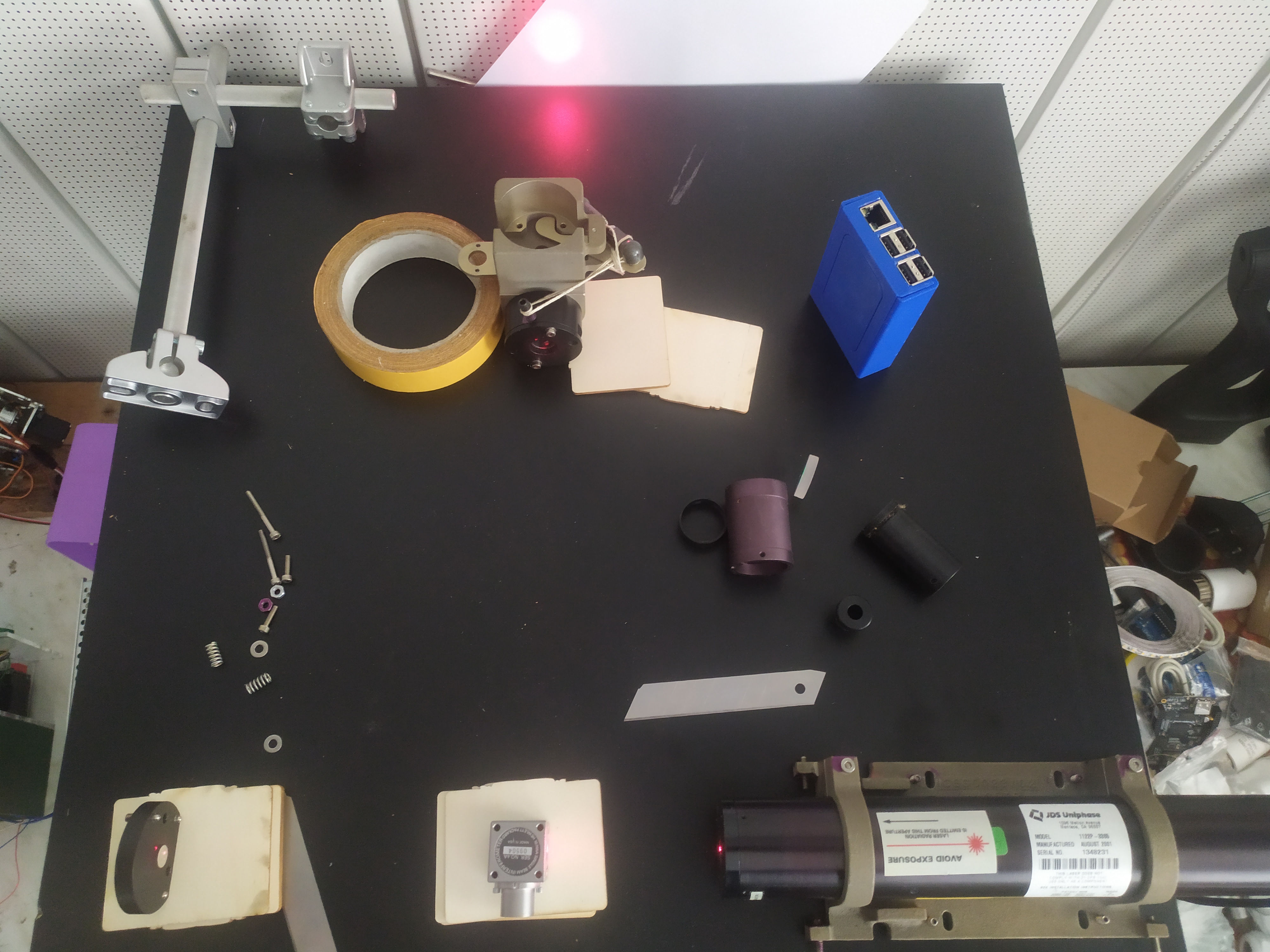 zleva rovinne zrcatko, uprostred interferometr (beam splitter) vcetne valcove cepicky kde je integrovany retroreflektor, vpravo HeNe laser, nahore kolinko v kterem je objektiv kvuli promitnuti detailu paprsku.