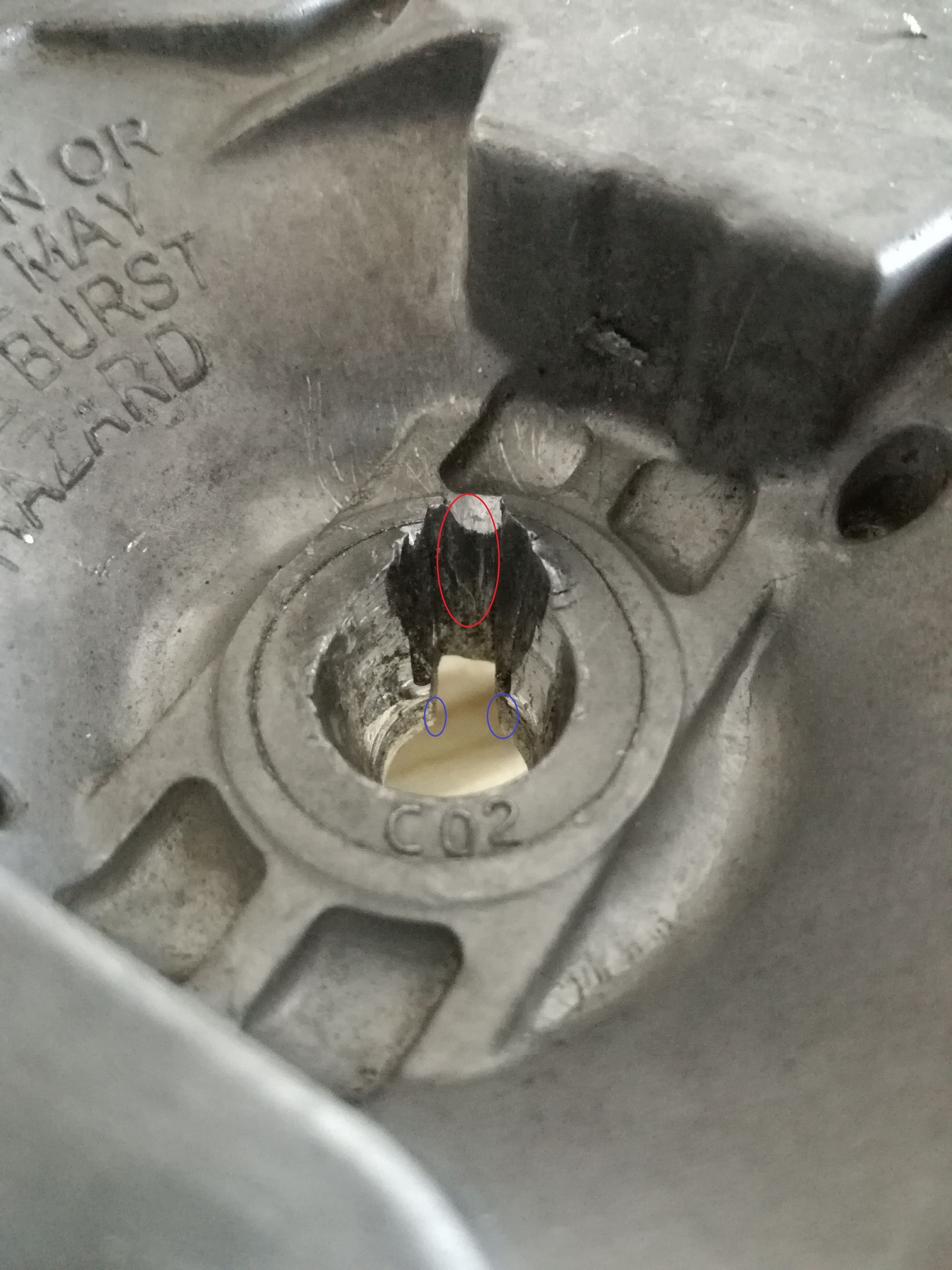 Modré kroužky nefunkční častí drážky. Červený kruh ryha po peru, ale pouze z poloviny.