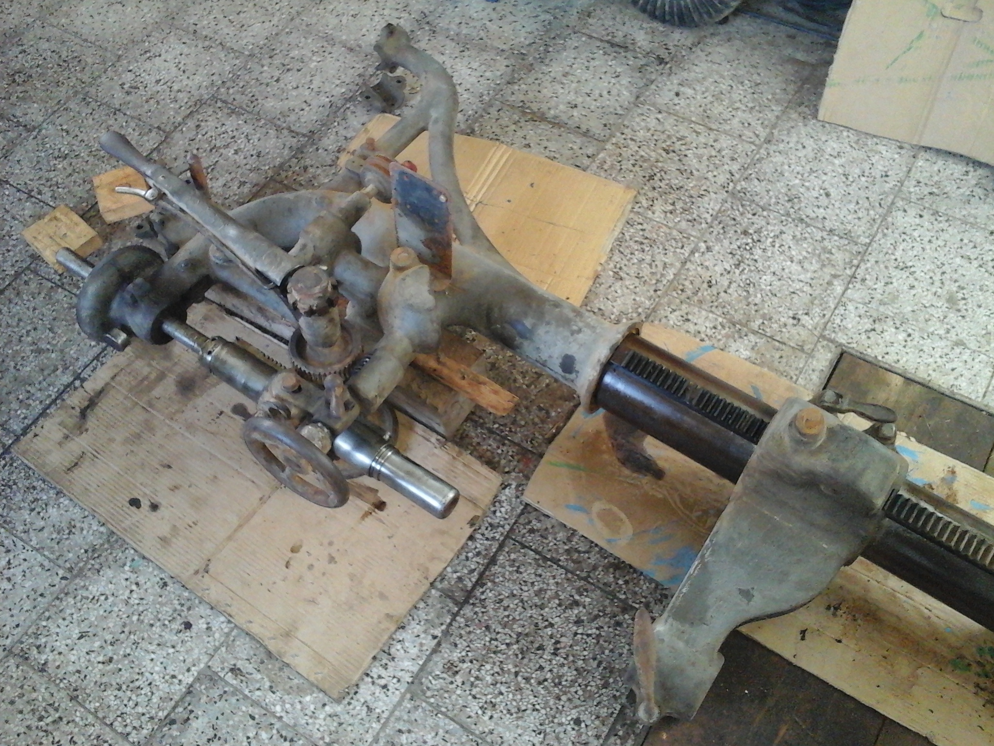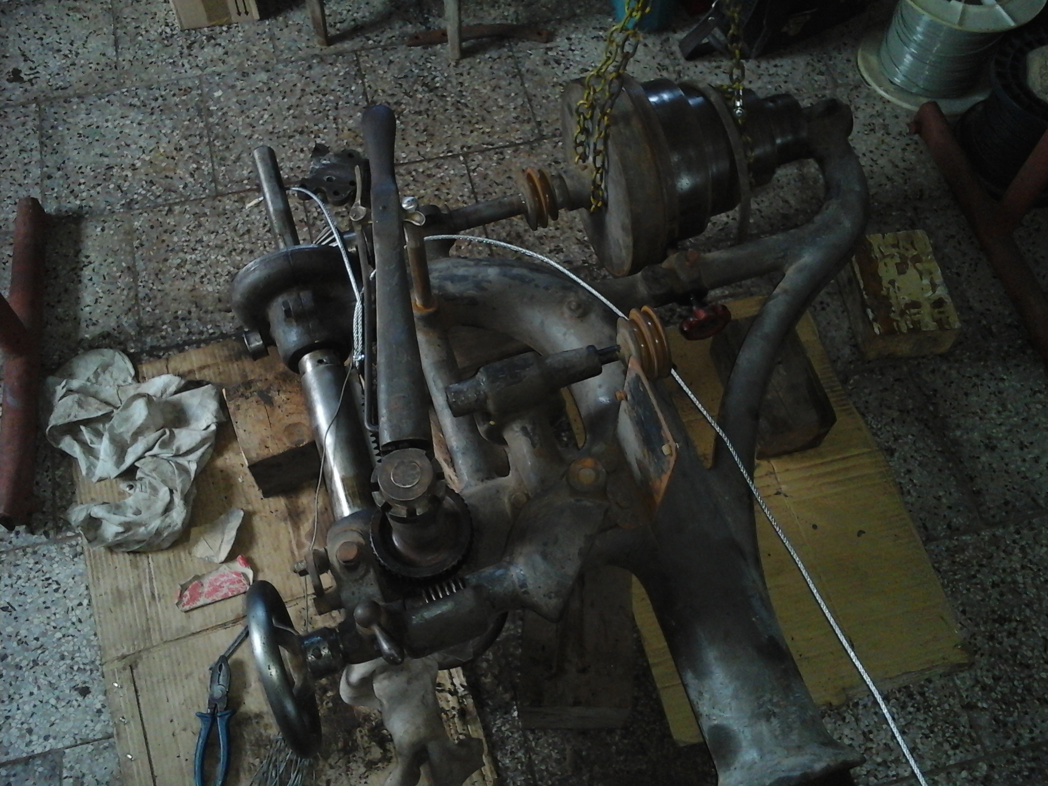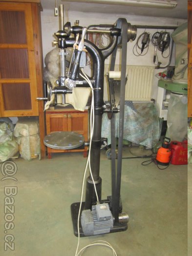 kvůli manipulaci sundané řemenice a otočný stolek. Spodní půlená, rozběhová řemenice byla patrně předělána na elektromotor (ale z 50. let) a horní kluzná ložiska s přimazáváním na valivá s pouzdry, naštěstí s původním uchycením.