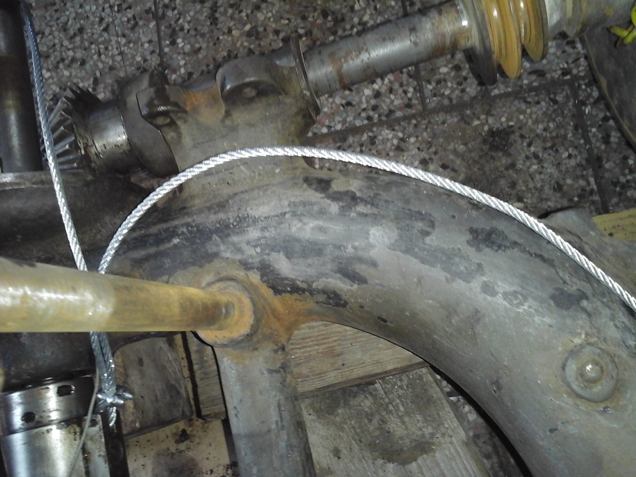 Řemenice v původním místě a chystá se lanko na závaží pro vracení vřeteníku