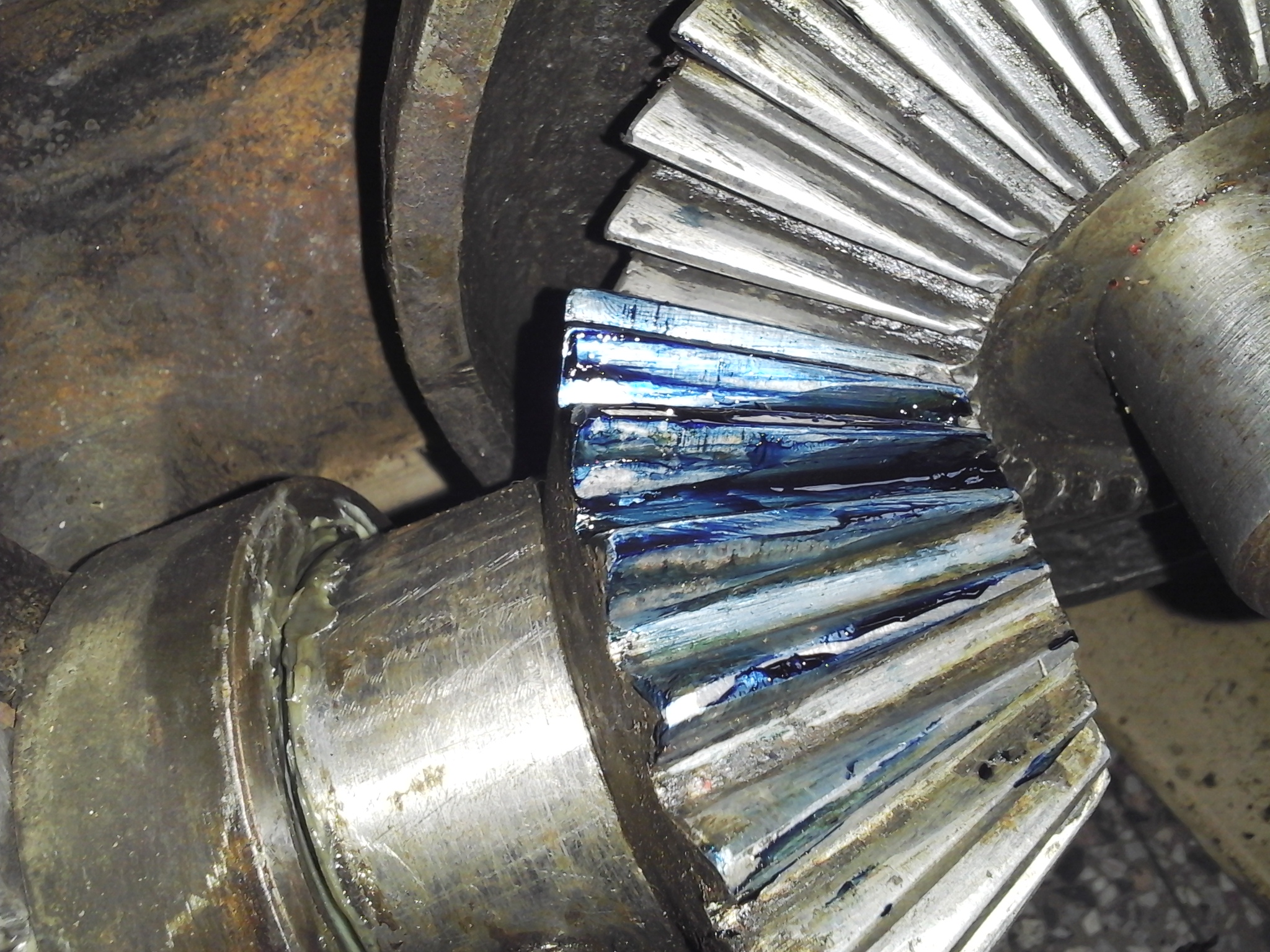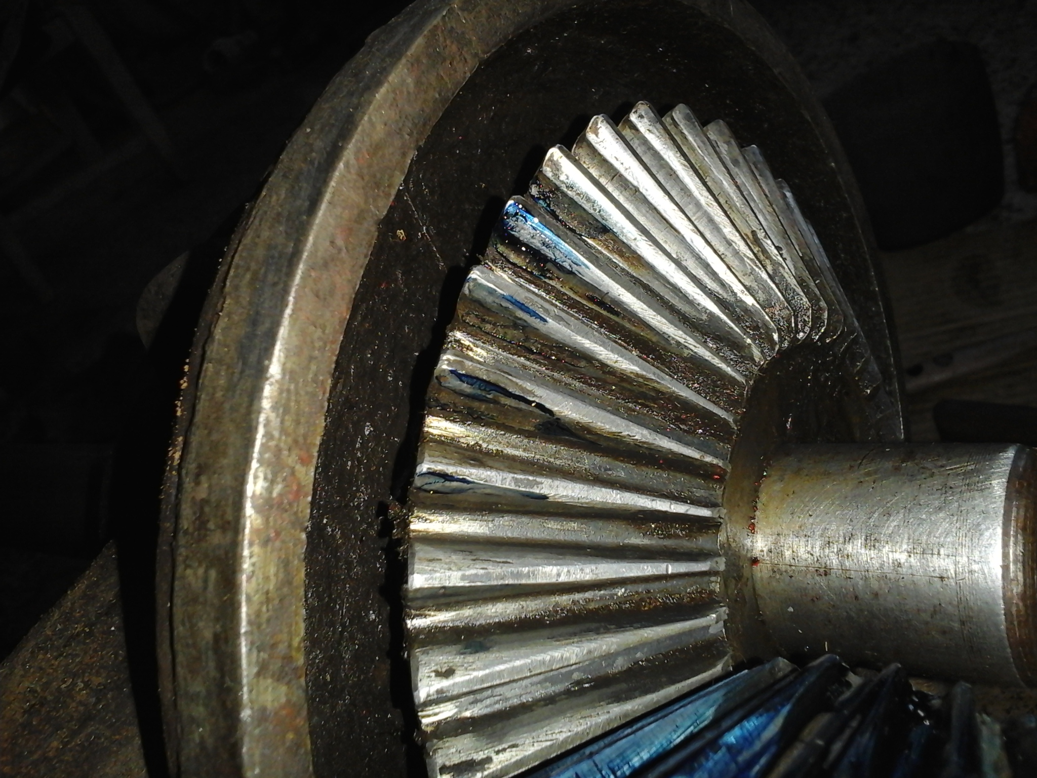 Před barvou jsem se ale zaměřil na kuželový převod, podle opotřebení zabírají zuby hlavně na větším průměru kola, ke středu nic.