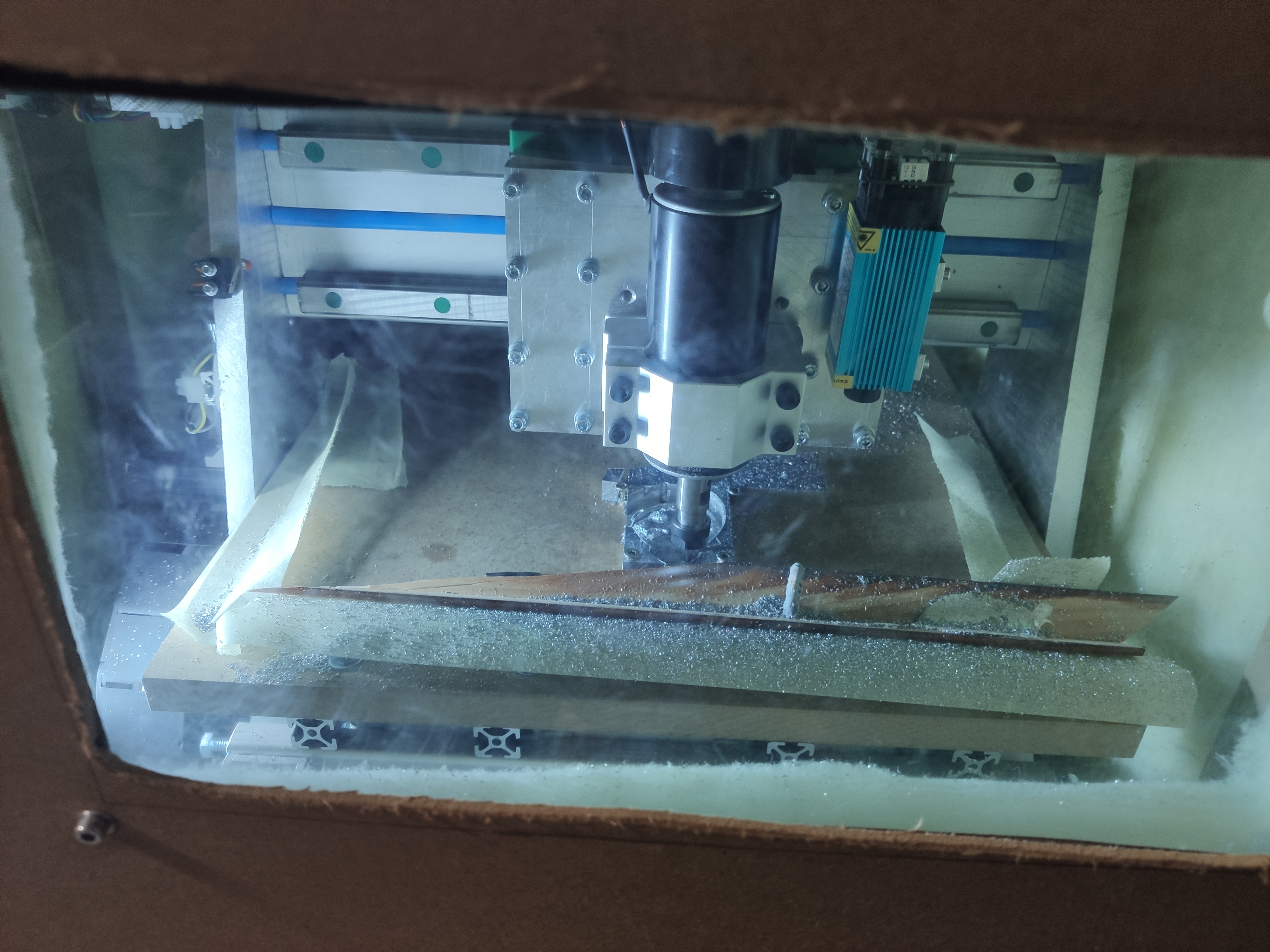 Ahoj, ak som sa cez arduino následne 3d tlač 2d lejzrovanie dosal až k aliexpress fréze. vetšina dielov z aliexpresu hliníkové profily od známeho známeho a hliníkové dosky od slovenského predajcu. diely boli postupne kupovane a postupne podlá rozmerou predajcu modelovane v sketchupe(rýchly jednoduchý) aby všetko sedelo. Po zložení som postupne nahrádzal elektrické diely z arduina som prešiel na nvcm v2.1, 24v zdroj na 36V, 500W spindla sa nedala ovládať pwm signálom tak som skúšal paralelne ovládanie mosfetu pomocou arduina a samozrejme som zhodil hlavný istič a mosfet odpálil a musel čakať kým z činy dorazí novy. Ovládanie je cez mach 3 ešte ho nemám kompletne nastavený ale časom sa k tomu dostanem. Drivery sú najlacnejšie TB6600 ktoré sa rady prehrievajú takže sa mi stáva že mi náhodne prestane íst os a samozrejme ostatne otom nevedia takže veľa zničených nástrojov momentálne očakávam nove 3x DM556 4tú os nechám na starom. Dovod preco som sa odhodlal pre stavbu je ze na aliexprese som našiel výhodnú cenu lineárov a dovoz z CZ. Plocha na opracovávanie je 240x640x45. Z dôvodu spolunažívaní v panelovej bytovke som musel pristúpiť na stavbu finančne nenáročného a nepekného kurníku vyplnenú sklenou vatou pre frézu a polozil som ju na izoláciu pre vodovodne trubky aby sa ani zem netriasla. Zvuk izoluje pekne no teplo bohužiaľ ešte lepšie takže potrebuje sem-tam vyvetrať.