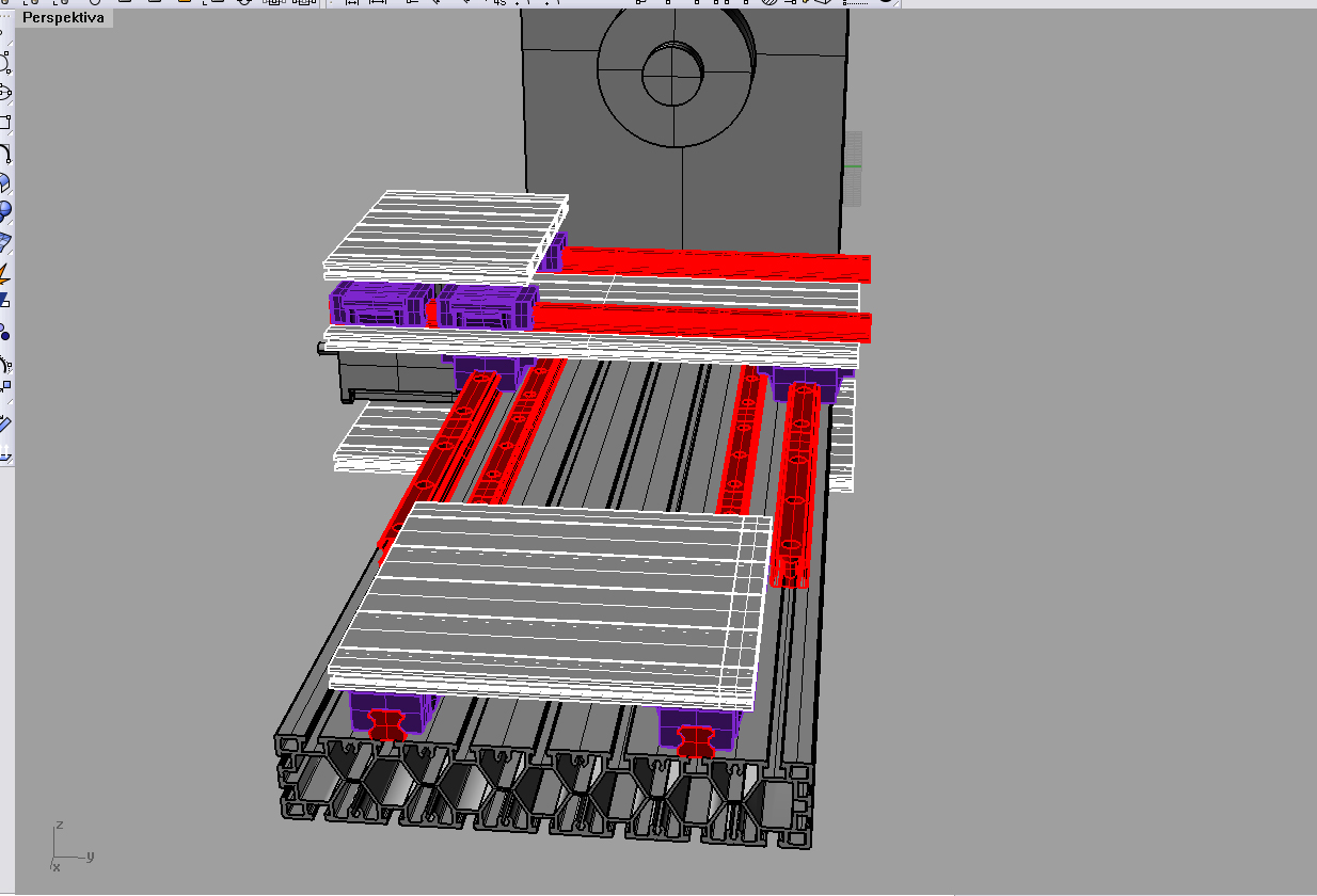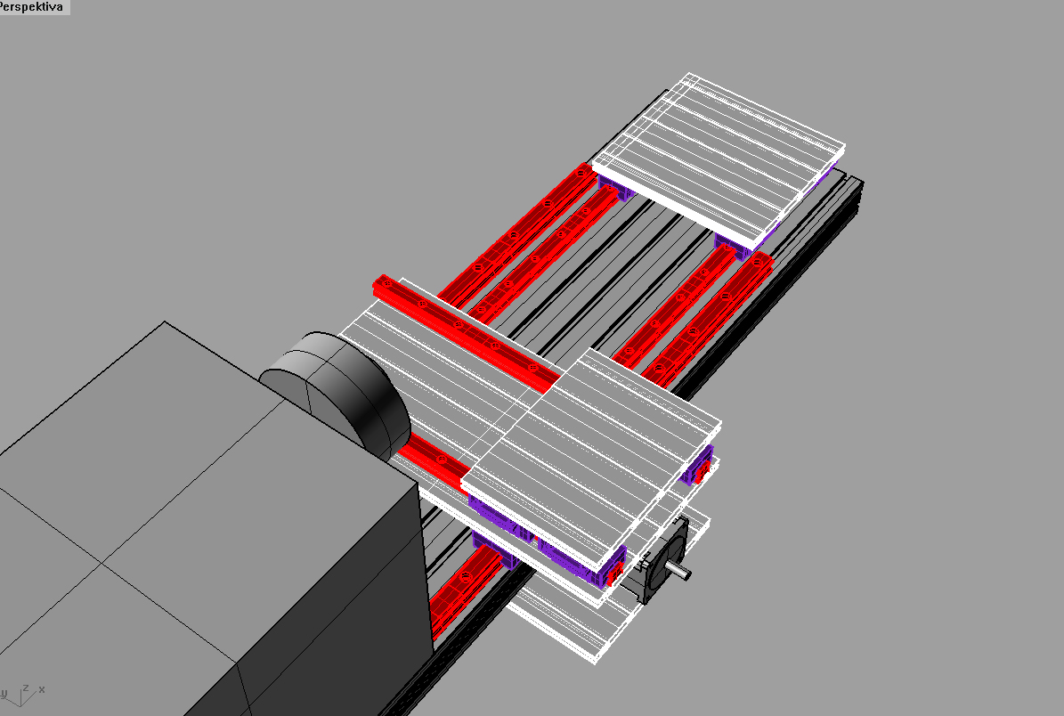 Přemýšlel jsem o pohonu servy ale asi to je zbytečné a použil bych dva krokáče od Microkonu SX34-3080 8Nm ( 1765,- kus ). Desky na ose Z a koníku jsou zatím kresleny z AL profilu 16x250 mm od Iselu (mám doma). Předpokládám že když jsou tyto desky pod šroubovány čtyřmi poměrně velkými vozíky a na Z desce jsou přišroubovány dvě vodící tyče velikosti 30, tak to bude dostatečně tuhé, případně mohu vyměnit za duralovou nebo ocelovou desku. Osa Z by taky mohla mít bočnice a jednu desku pod stolem, tím by se to mohlo ještě více vyztužit.