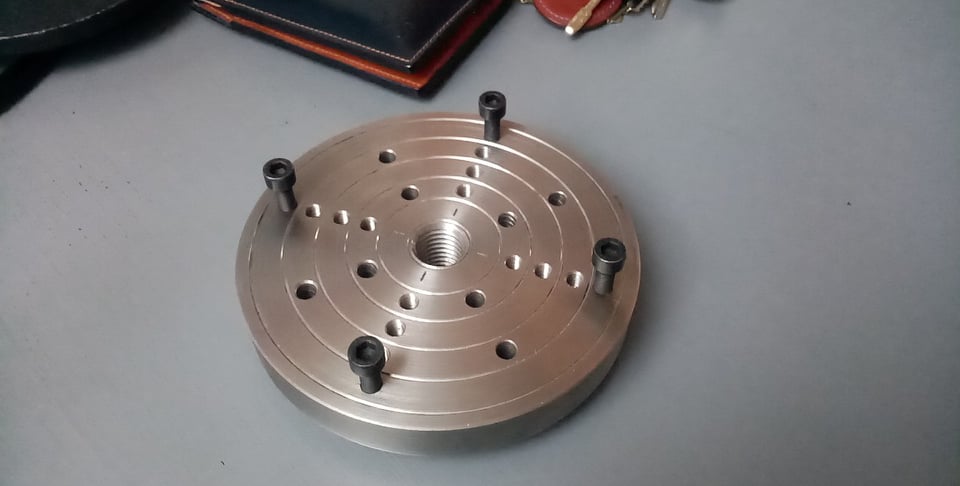 Kutil jsem kutil... A vyšla z toho nová příruba na dřevo soustruh. Kamarád potřeboval novou a lepší přírubu na malý čínský soustruh na dřevo. Původní byla svařovaná, tenká a měla málo upínacích otvorů. Ta nová je z litiny, která mi zbyla, když jsem dělal příruby na univerzálky. Udělal jsem jí těžší, takže funguje jako setrvačník a když se obrábí třeba hranol, tak stroj tolik nevibruje při přerušovaném řezu. Na čele jsou středící drážky, usnadňující vystředění špalku. Jsou odstupňované po 20 mm. Přidal jsem více upínacích otvorů, jedny jsou se závitem M6, druhé bez. A jako bonus hází méně, než ta původní.