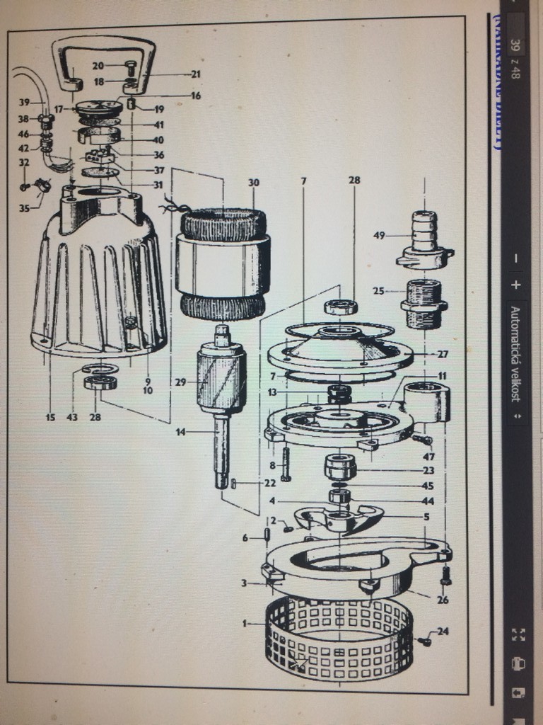 Tak zrovna výměna přívodního kabelu je primitivně jednoduchá, tedy teoreticky. Nahoře uprostřed pod horním uchem je zátka s jemným závitem, okolo M 40. V zátce jsou dvě slepé díry pro klíč, něco jako na kotouč úhlové brusky. Přímo pod zátkou je krásně přístupná "čokoláda". Já ale musel na rezavých šroubech ucha vypilovat dvě plošky aby je bylo za co povolit a poté do zátky vyvrtat větší díry na větším průměru, čerpadlo chytit do svěráku a poměrně masivním klíčem přitlačovaným truhlářskou svěrkou aby nevyklouzával pomocí kladiva zátku vyšroubovat. Zátka je těsněná O-kroužkem a kabel závitovou průchodkou jako bývají na krabicích s elektrikou.