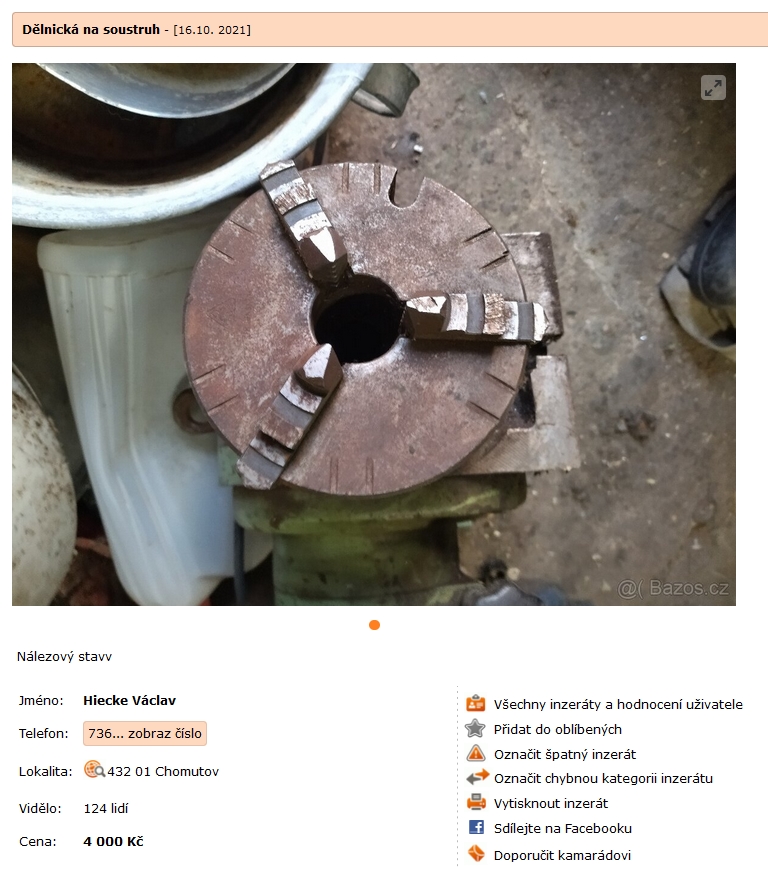 No hustej je,ten by mohl jít od hodiny dělat k fízlům do Jihlavy (a možná i jinde jsou ve službě idioti podobných kvalit)-popravdě jsem ale nepochopil,co vlastně nabízí.. "Dělnická na soustruh". třeba je to něco ,sloužící k obrábění,ne jen ta bývalá univerzálka.. Asi by tam měl spíš uvést váhu,od té se ev. může odvíjet cena k jednání.U nás vykupují aktuálně asi za pětikačku kilo,ale když si pro to jedou,je to míň.. :D :D :D