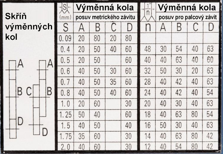 Teď k tomu přehazování kol. Na levé straně soustruhu máš sadu kol. Horní hnací, pak mezikolo a hnané kolo na posuvovém šroubu.