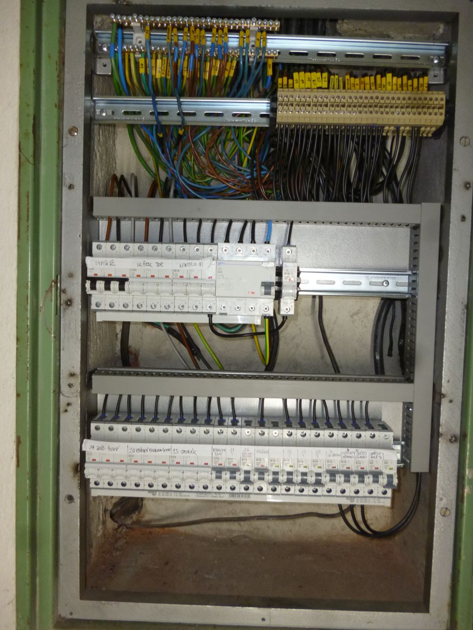 Původní rozvaděč a elektroinstalace byla hodně slušně udělaná v dobách JZD (vše je taženo kabely a vše je 3x, sice v Al ale neva), ale od té doby se v tom po baráku bohužel vrtalo strašně moc lidí vč. nějakého Ukrajince, některé krabice jsou zaomítané, někde byly převrtané kabely a spojovalo se to atd.
