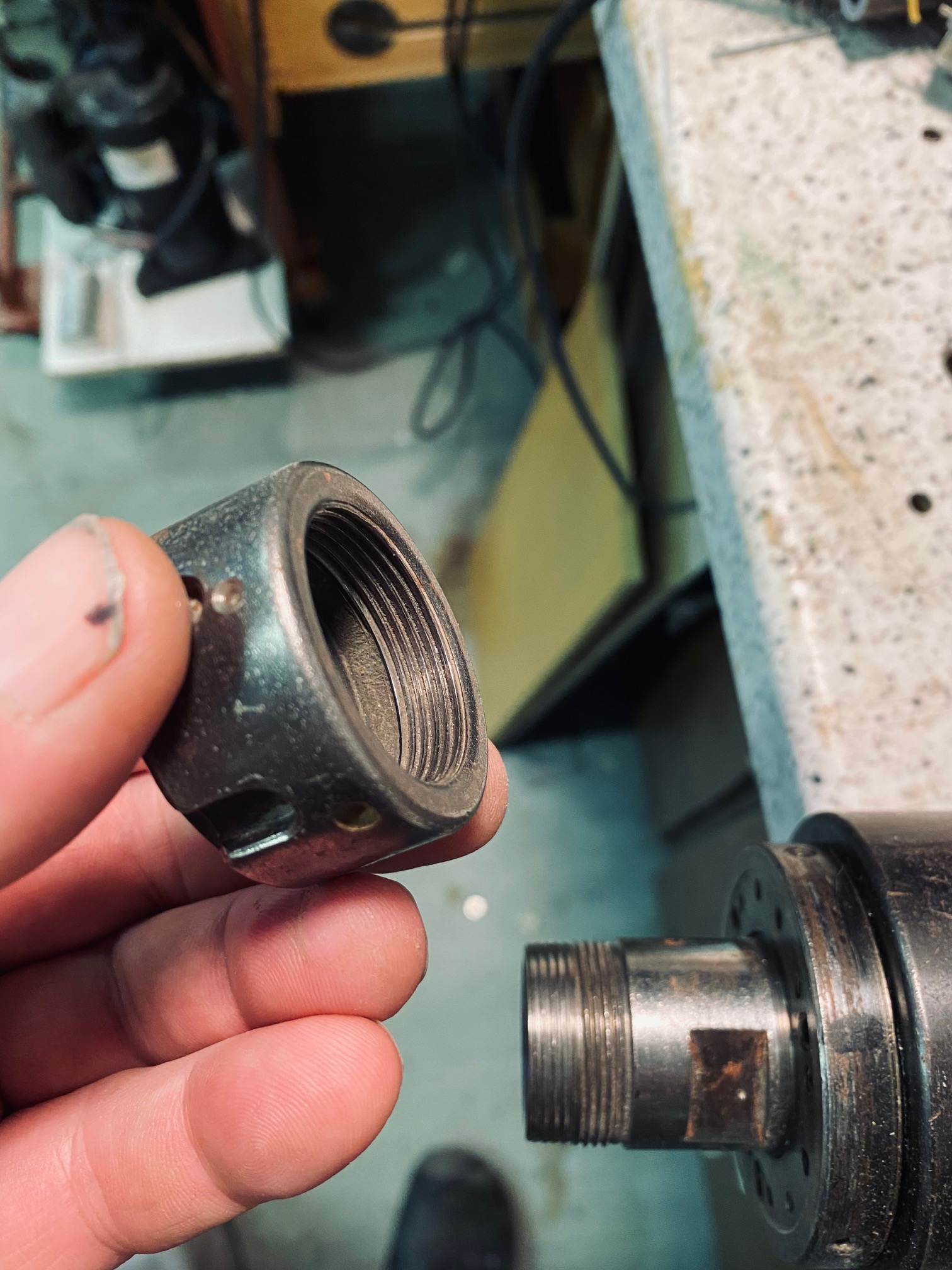 Jak vzniklo poškození nevím, takhle jsem ho koupil. Původní projekt, kde by se dalo použít bez problémů jsem nerealizoval, přesněji udělal jsem to jinak. Nechat válet 4,5kW vřeteno ve skříni je škoda, hlavne když by se dalo modifikovat na mojí FN20. Průměr závitu je cca 32mm.