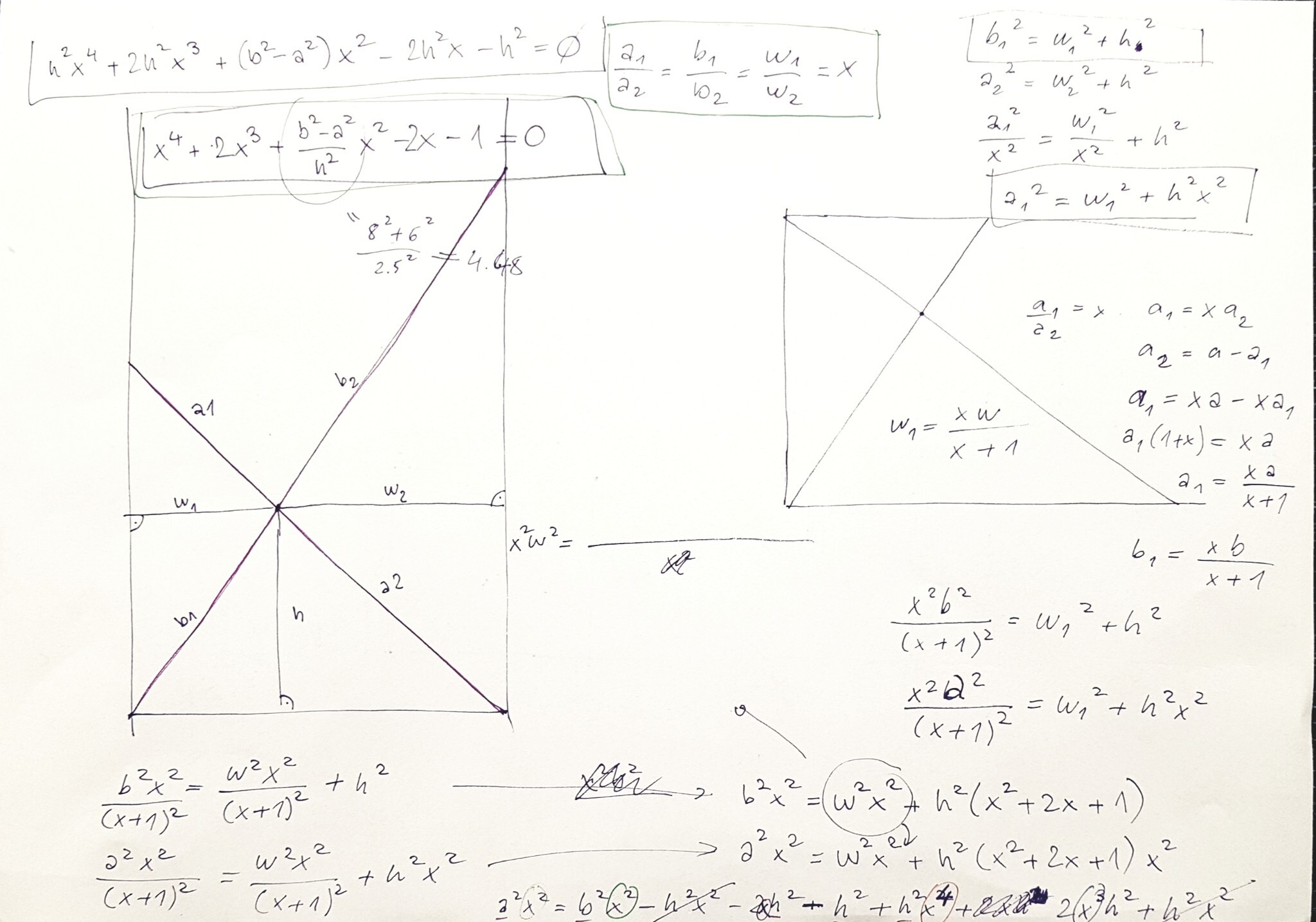 Tak som sa do toho pustil graficky. Vychádzal som z toho že keby šírka studne bola 600, tak menší rebrík leží na dne a priesečnica je v nulovej výške. Názorne som zmenšoval šírku studne o 50cm. Vždy som potom vykreslil pozíciu v ktorej sa nachádzajú rebríky a ich priesečník. Každá pozícia je v inej farbe, prípadne iným typom čiary. Pevný bod je vpravo dole, ten je nemenný.