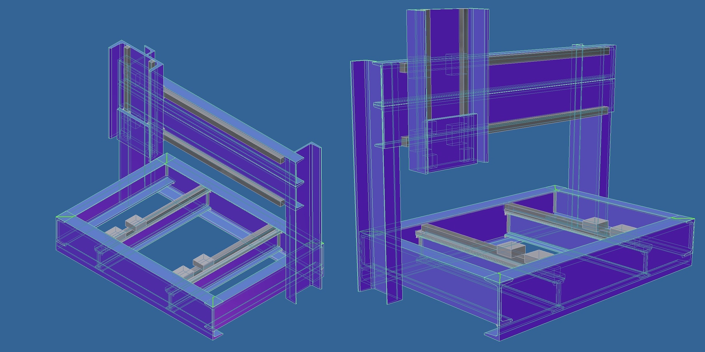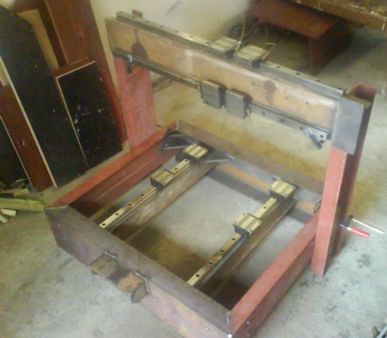 Tak samotny spodny ram... na diely sa vyrobili presne pravouhle Lka, cele sa to zosrubovalo v rohoch s presnostou asi pol desatiny (velka suplera + pol metrovy uholnik) a pozatahovalo 80Nm, nasledne bolo zbodovane a zvarane COckom (zmes plynu a material drotu nepametam), po zvareni presiel ram 3x zima/teplo a odchilky po zvareni boli +-2 desatiny.Uz to lezi v roznych polohach pol roka a nez sa to za mesiac-2 dostane na frezu (koli rozmerom) tak to dufam aspon trosicku sadne. Sam som zvedavy ako sa to do dnesneho dna pohlo, zial "megasublera" ani uholnik neni na dosah. Ono dosadacie plochy uz su na hrubo prefrezovane, ale na jemno to pojde ako celok. Stlpy a ten "bazmek" na vrchu budu srubovatelny, takze ta geometria, vrtulovitost a rovnobeznost sa bude dat doladit, potom by sa to mohlo vo finale az zatuhne farba medzi spojmi skolikovat. A co sa tyka ulozenia vedeni... budu ulozene v jakomsi Lku, ze sa jednou stranou opru. Tu mam ale strach, kedze ide o predpnute sety, aby to frezar dokazal udrzat v rovnobeznosti max stotinu +-. Stotinka hore dole sa doladi klinikom z druhej strany. Bohuzial I profily na ktorych ma sediet vedenie sa mi zda poddimenzovane, aj ked na ne este idu po celej dlzke 15mm hrube podlozky, resp to Lko na vedenie.