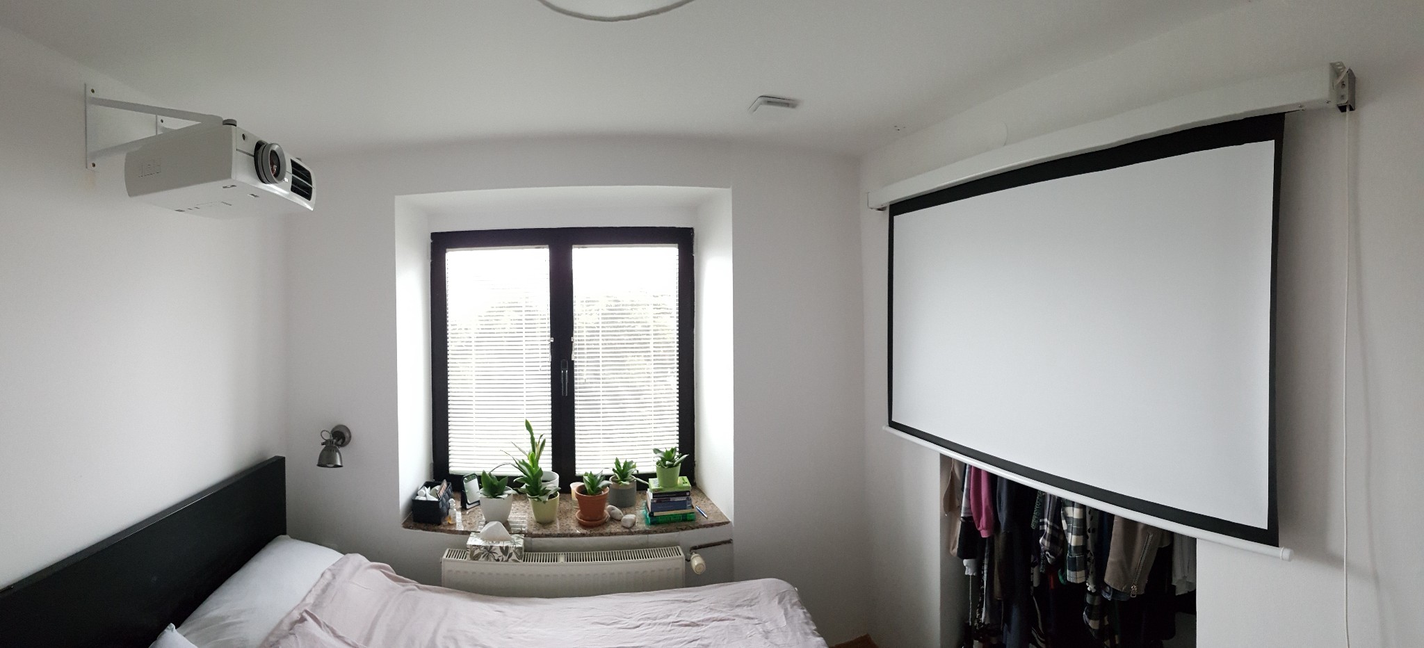 Děkuju za pochvalu! Toto jsou samozřejmě klasické reklamní fotografie bez kabeláže :D Chvíli to budeme provozovat na hulváta (napájecí kabel do zásuvky /stejně tak u plátna/, HDMI kabel do notebooku, zvuk přes BT repráček). Pokud se koncept osvědčí, rád bych celé nějak zaintegroval dokupy včetně pevného ozvučení (2.1) a HTPC (snad i v roli TV STB) a kabeláž samozřejmě co nejvíce skryl. Nějaké možnosti jsou, pod skutečným stropem je sádrokartonový podhled, na ty eLka nad projektorem přijde polička na zmiňované cajky. Stranou už si pomalu řeším ten zvuk a promýšlím co a jak..